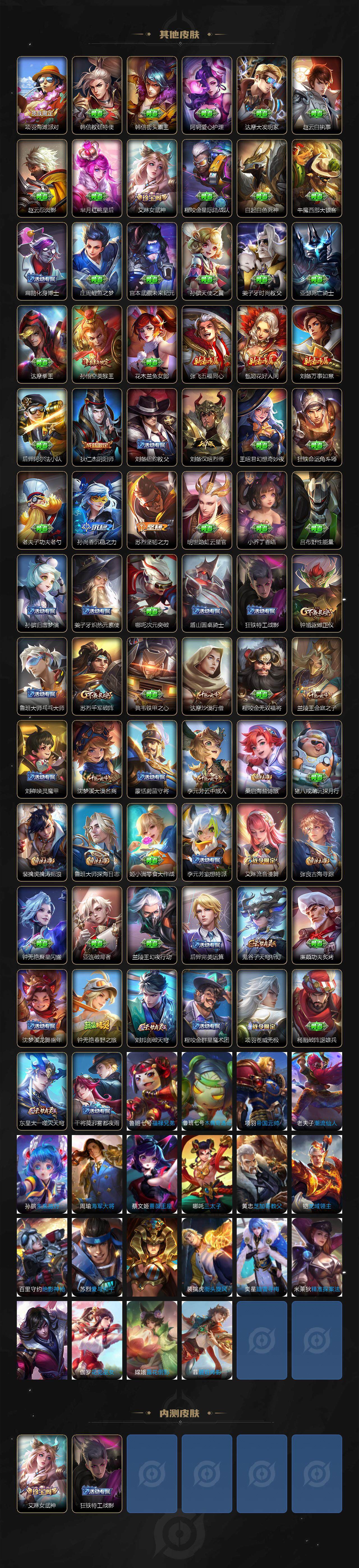 【其他皮肤】:项羽海滩派对,韩信教廷特使,韩信街头霸王,阿轲爱心护理,达摩大发明家,赵云白执事,赵云忍炎影,芈月红桃皇后,艾琳女武神,程咬金星际陆战队,白起白色死神,牛魔西部大镖客,扁鹊化身博士,庄周鲤鱼之梦,宫本武藏未来纪元,孙膑天使之翼,姜子牙时尚教父,亚瑟死亡骑士,达摩拳王,孙悟空美猴王,花木兰兔女郎,张飞五福同心,甄姬花好人间,刘备万事如意,后羿阿尔法小队,狄仁杰阴阳师,刘备纽约教父,刘备汉昭烈帝,王昭君幻想奇妙夜,狂铁命运角斗场,老夫子功夫老勺,孙尚香沉稳之力,苏烈坚韧之力,明世隐虹云星官,小乔丁香结,吕布野性能量,孙膑归虚