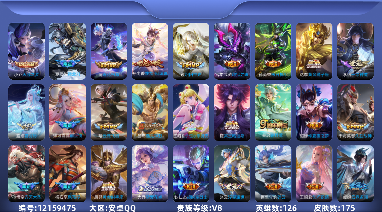 [12159475]【特价急出/详情看图】:安卓Q-V8-永恒钻石IV段位-126英雄-175皮肤-1典藏-29传说-55史诗