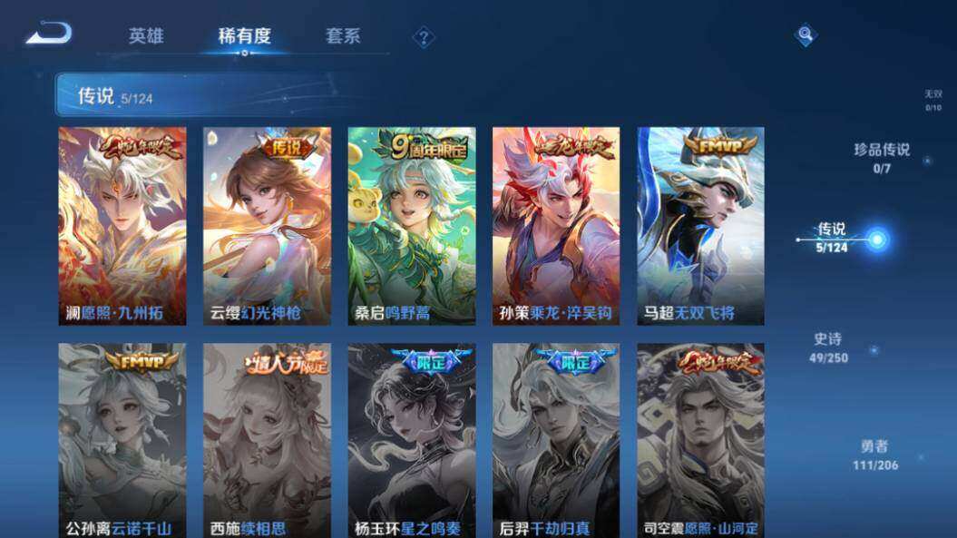【传说皮肤】:澜愿照九州拓,云缨幻光神枪,桑启鸣野蒿,孙策乘龙淬吴钩,马超无双飞将