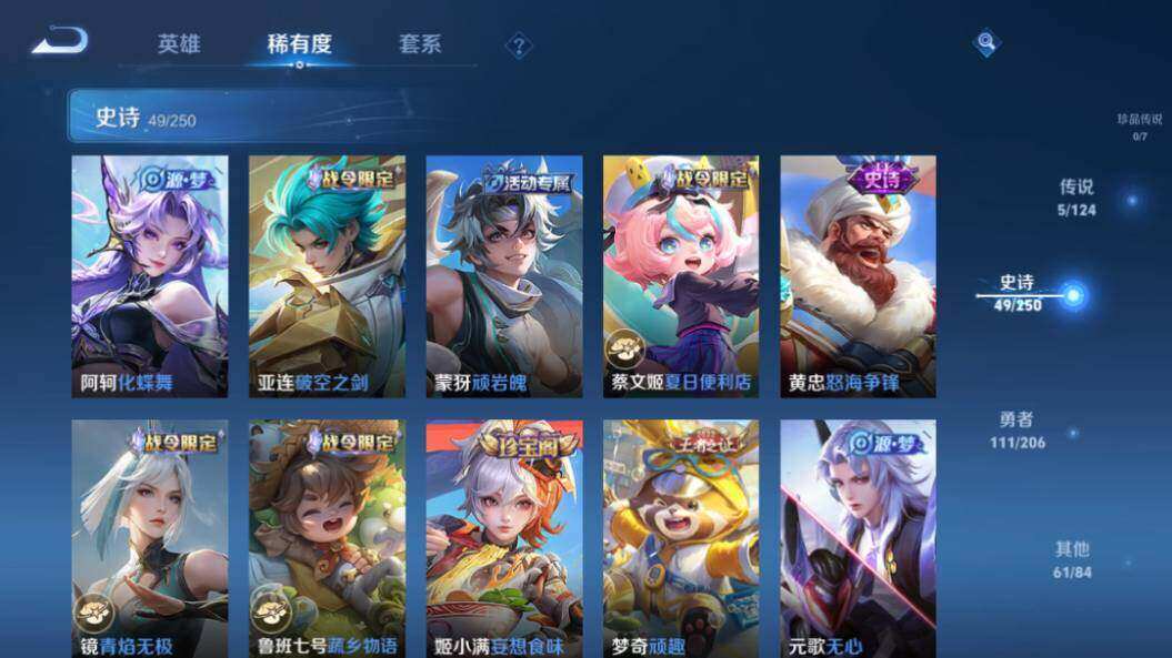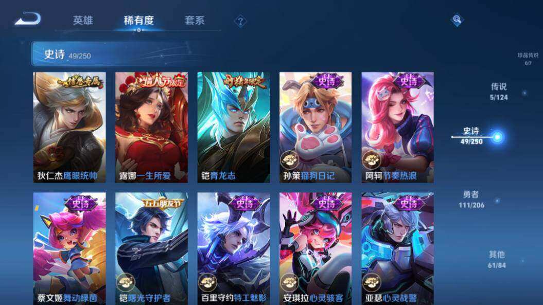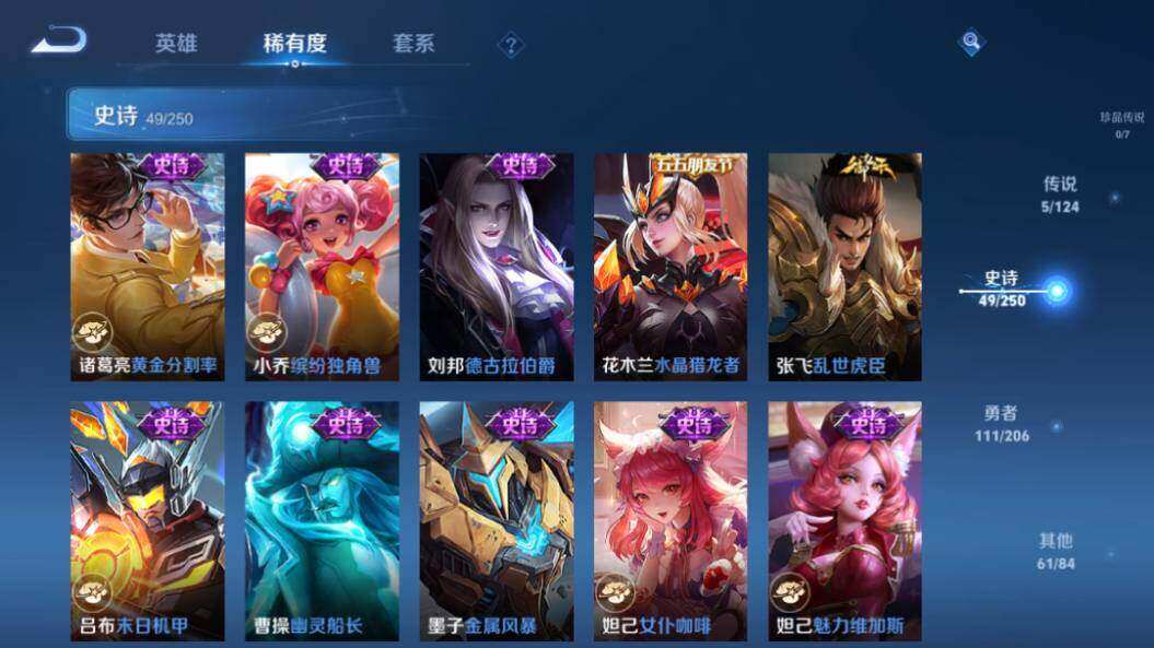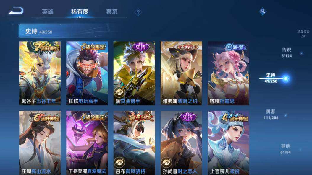 - PX_2094466-37 安卓QQ/绝世王者/271皮肤/125英雄/0典藏/0珍品无双/0无双/1珍品传说/14传说/78史诗/9稀有英雄 【1 珍品传说】怪盗基德 马可波罗, 【14 传说皮肤】启明星使 虞姬,碎云 百里守约,地狱火 孙悟空,仲夏夜之梦 貂蝉,落雪白狼 亚连,时雨天司 诸葛亮,黄金射手座 后羿,乘龙·问璇玑 孙尚香,一念神魔 李信,淬星耀世 赵云,超时空战士 狄仁杰,冠军飞将