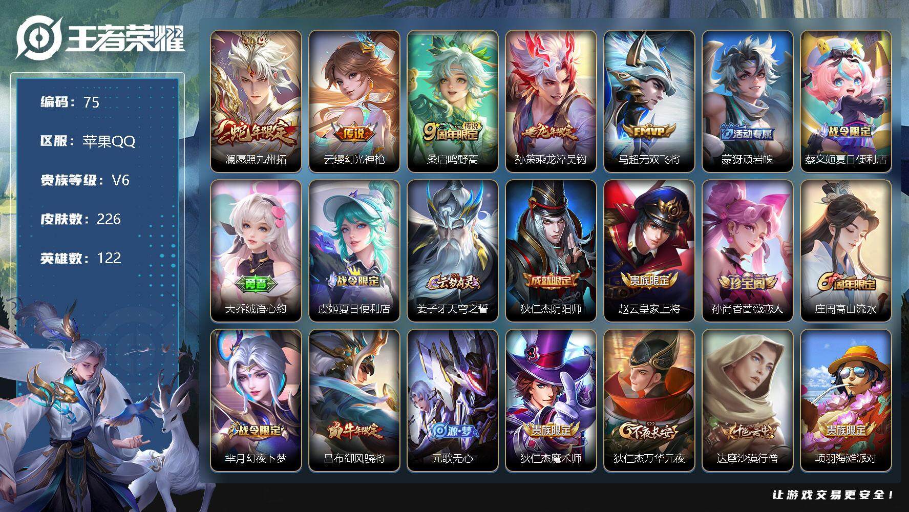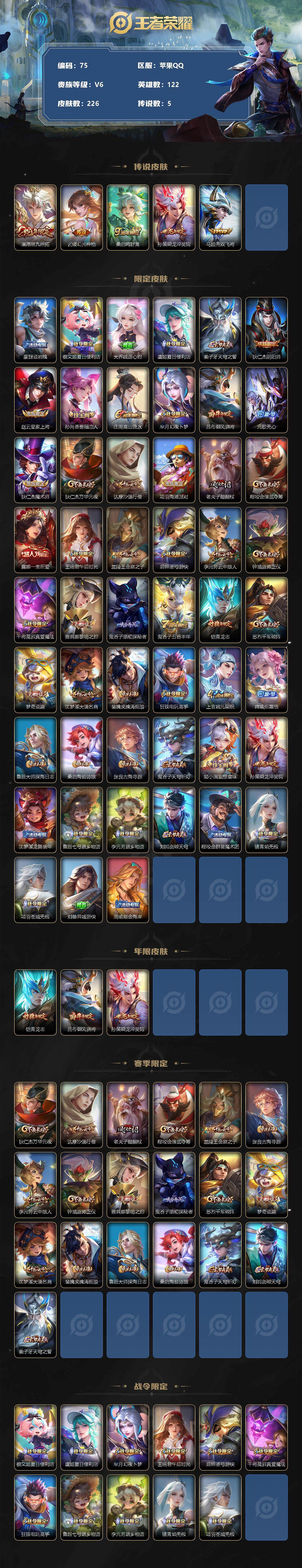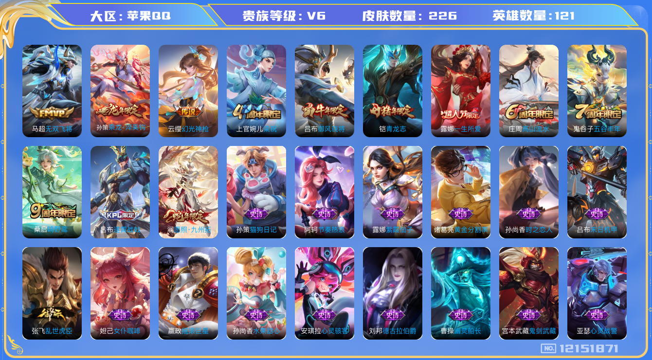 [12151871]【商品标题】:MQ521-苹果Q-V6-至尊星耀III段位-122英雄-226皮肤-0典藏-0珍品无双-0无双-0珍品传说-5传说-49史诗