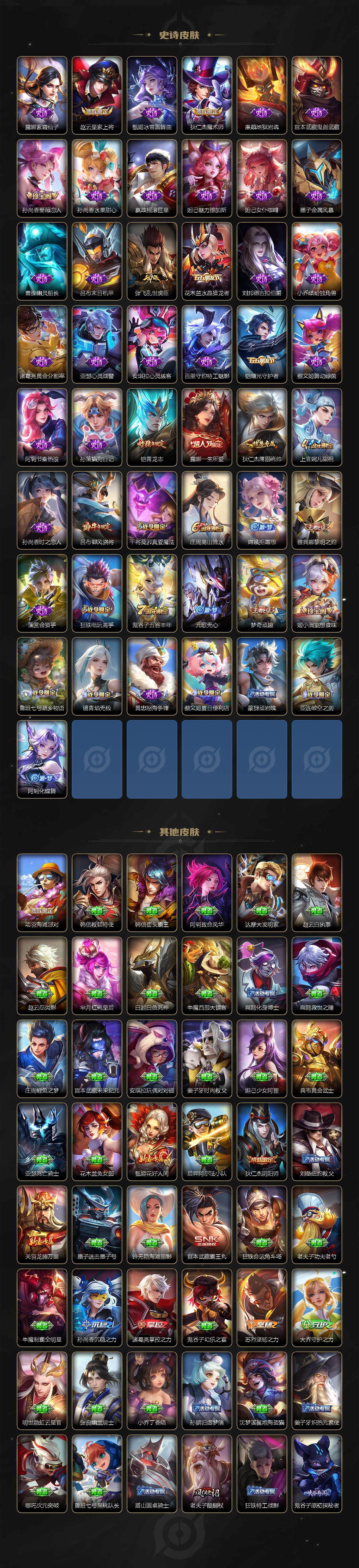 【史诗皮肤】:露娜紫霞仙子,赵云皇家上将,甄姬冰雪圆舞曲,狄仁杰魔术师,廉颇地狱岩魂,宫本武藏鬼剑武藏,孙尚香蔷薇恋人,孙尚香水果甜心,嬴政摇滚巨星,妲己魅力维加斯,妲己女仆咖啡,墨子金属风暴,曹操幽灵船长,吕布末日机甲,张飞乱世虎臣,花木兰水晶猎龙者,刘邦德古拉伯爵,小乔缤纷独角兽,诸葛亮黄金分割率,亚瑟心灵战警,安琪拉心灵骇客,百里守约特工魅影,铠曙光守护者,蔡文姬舞动绿茵,阿轲节奏热浪,孙策猫狗日记,铠青龙志,露娜一生所爱,狄仁杰鹰眼统帅,上官婉儿梁祝,