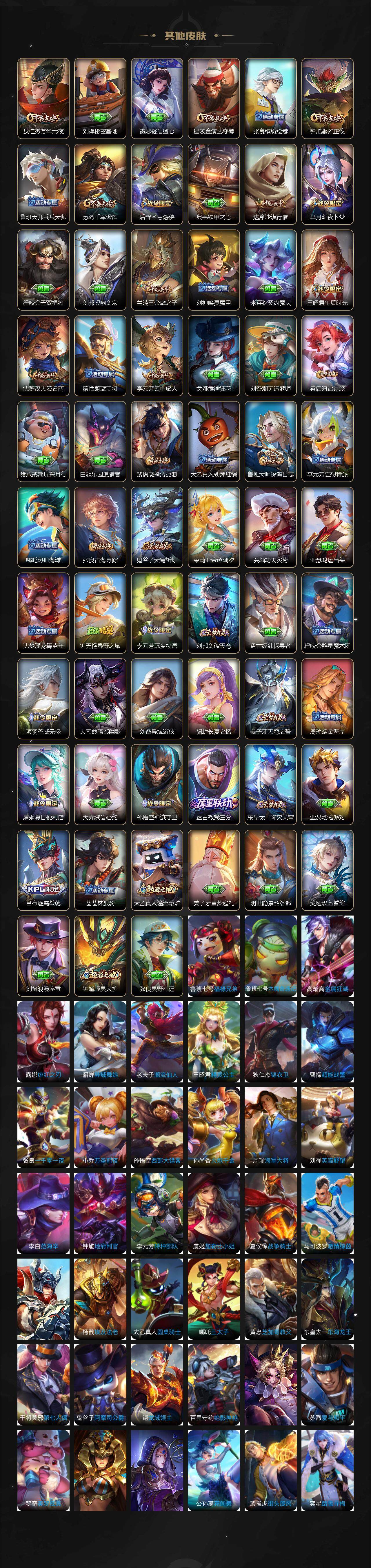 【赛季限定】:狄仁杰万华元夜,达摩沙漠行僧,老夫子醍醐杖,程咬金演武夺筹,兰陵王金庭之子,张良古海寻踪,李元芳云中旅人,钟馗驱傩正仪,雅典娜黎明之约,鬼谷子原初探秘者,苏烈千军破阵,梦奇顽趣,沈梦溪大漠名商,裴擒虎擒涛扼浪,鲁班大师探海日志,桑启海盐诗旅,鬼谷子天穹祈灯,刘邦剑破天穹,姜子牙天穹之誓