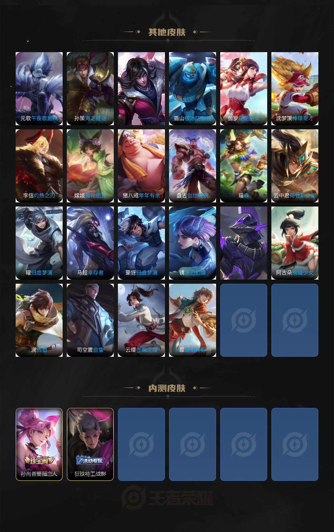 【限定皮肤】:蒙犽顽岩魄,蔡文姬夏日便利店,大乔绒语心约,虞姬夏日便利店,姜子牙天穹之誓,狄仁杰阴阳师,赵云皇家上将,孙尚香蔷薇恋人,庄周高山流水,芈月幻夜卜梦,吕布御风骁将,元歌无心,狄仁杰魔术师,狄仁杰万华元夜,达摩沙漠行僧,项羽海滩派对,老夫子醍醐杖,程咬金演武夺筹,露娜一生所爱,王昭君午后时光,兰陵王金庭之子,后羿圣弓游侠,李元芳云中旅人,钟馗驱傩正仪,干将莫邪真爱魔法,雅典娜黎明之约,鬼谷子原初探秘者,鬼谷子五谷丰年,铠青龙志,苏烈千军破阵,梦奇顽趣,沈梦溪大漠名商,裴擒虎擒涛扼浪,狂铁电玩高手,上官婉儿梁祝,嫦娥拒霜思,鲁班大师探海日志,桑启海盐诗旅,张良古海寻踪,鬼谷子天穹祈灯,姬小满妄想食味,孙策乘龙淬吴钩,沈梦溪龙舞盛年,鲁班七号蔬乡物语,李元芳蔬乡物语,刘邦剑破天穹,程咬金群星魔术团,镜青焰无极,项羽苍威无极,刘备异域游侠,周瑜熔金海岸