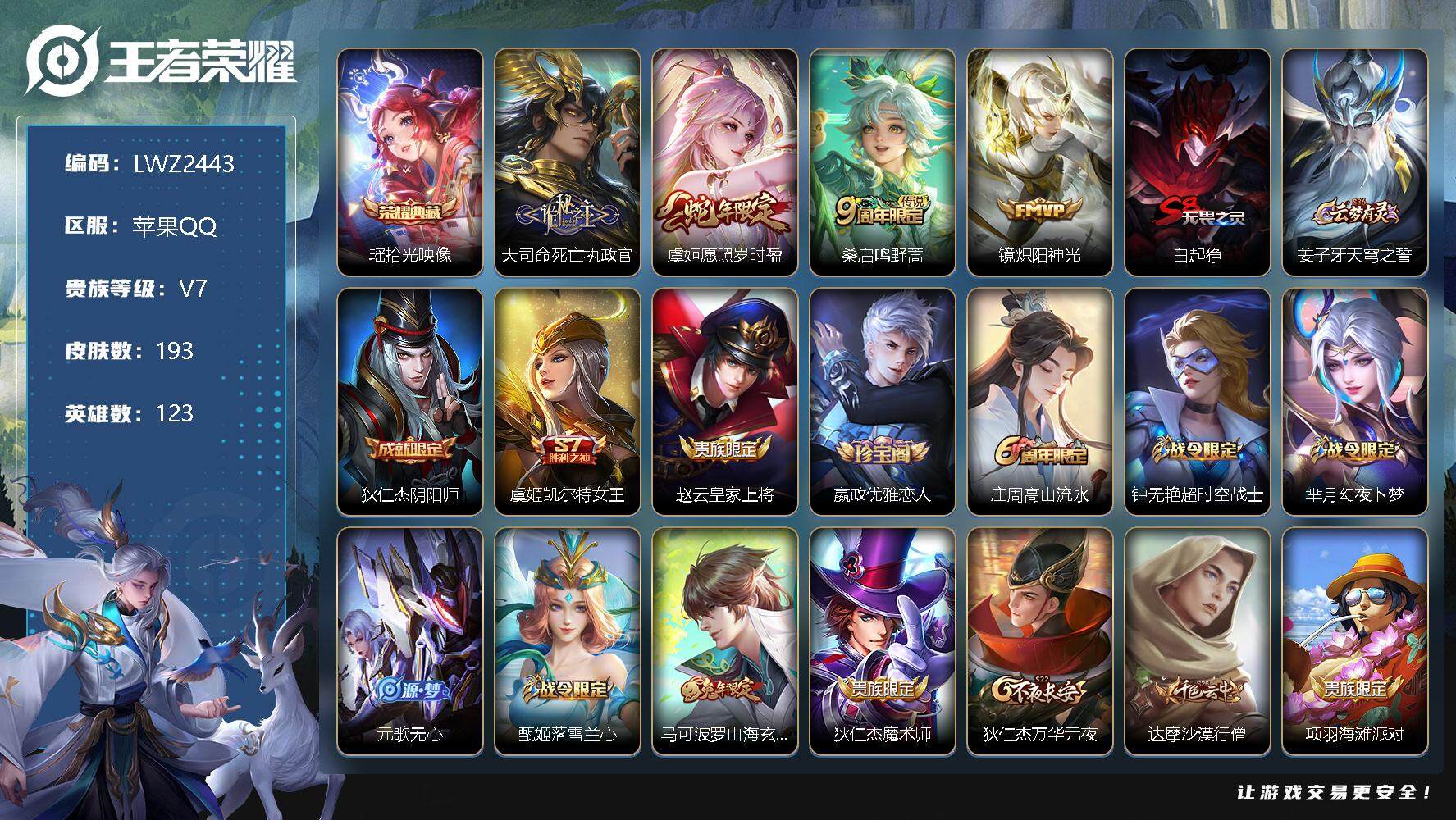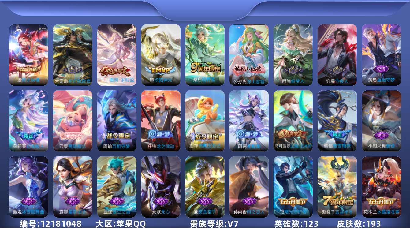 [12181048]【特价急出/详情看图】:苹果Q-V7-最强王者段位-123英雄-193皮肤-1典藏-4传说-59史诗