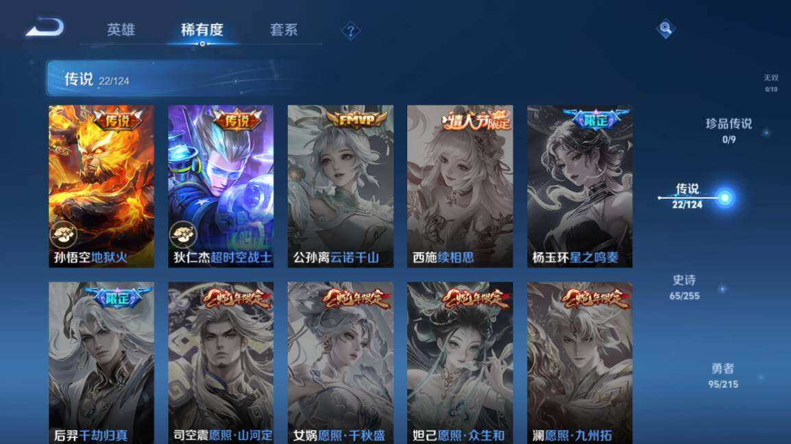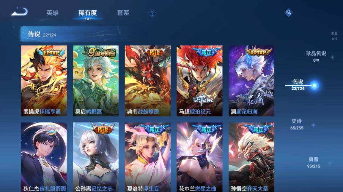 【传说皮肤】:裴擒虎祥瑞亨通,桑启鸣野蒿,典韦战鼓燎原,马超琥珀纪元,澜逐花归海,狄仁杰夜礼服假面,公孙离记忆之芯,夏洛特浮生妄,花木兰燃星之曲,孙悟空齐天大圣,吕布怒海麟威,李白诗剑行,百里守约碎云,孙尚香音你闪耀,马可波罗深海之息,后羿无尽星芒,马超无双飞将,孙策末日机甲,铠绛天战甲,虞姬启明星使,孙悟空地狱火,狄仁杰超时空战士