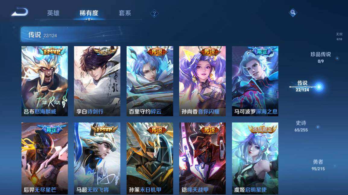 - PX_2103062-Q/永恒钻石/87皮肤/97英雄/0典藏/0珍品无双/0无双/0珍品传说/5传说/27史诗/8稀有英雄 【5 传说皮肤】凤求凰 李白,炽阳神光 镜,久胜战神 干将莫邪,一念神魔 李信,淬星耀世 赵云, 【27 史诗皮肤】苍穹之光 项羽,德古拉伯爵 刘邦,星夜王子 白起,无限星赏官 公孙离,冰锋战神 关羽,修罗 橘右京,魅力维加斯 妲己,凤凰于飞 王昭君,女仆咖啡 妲己,晚萤