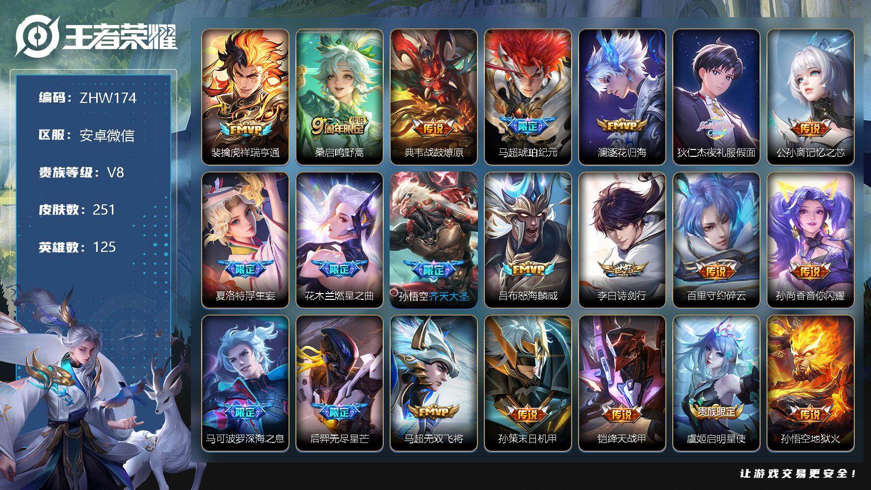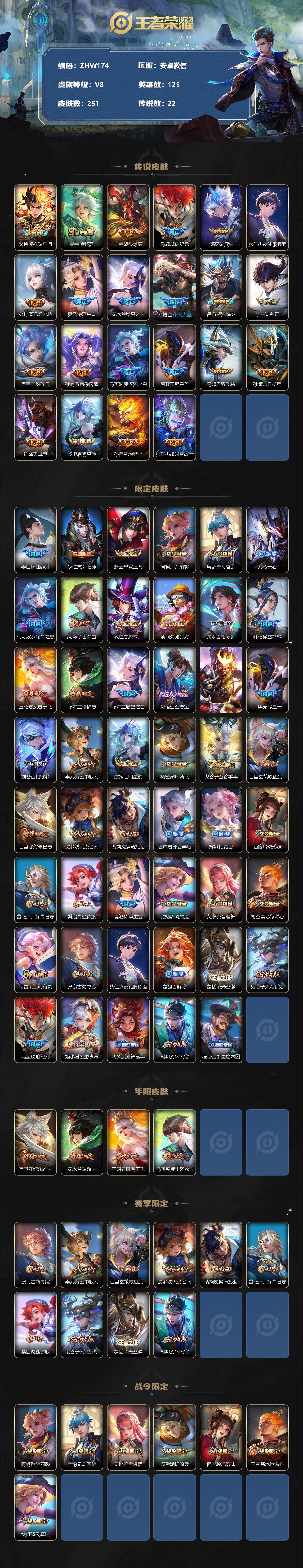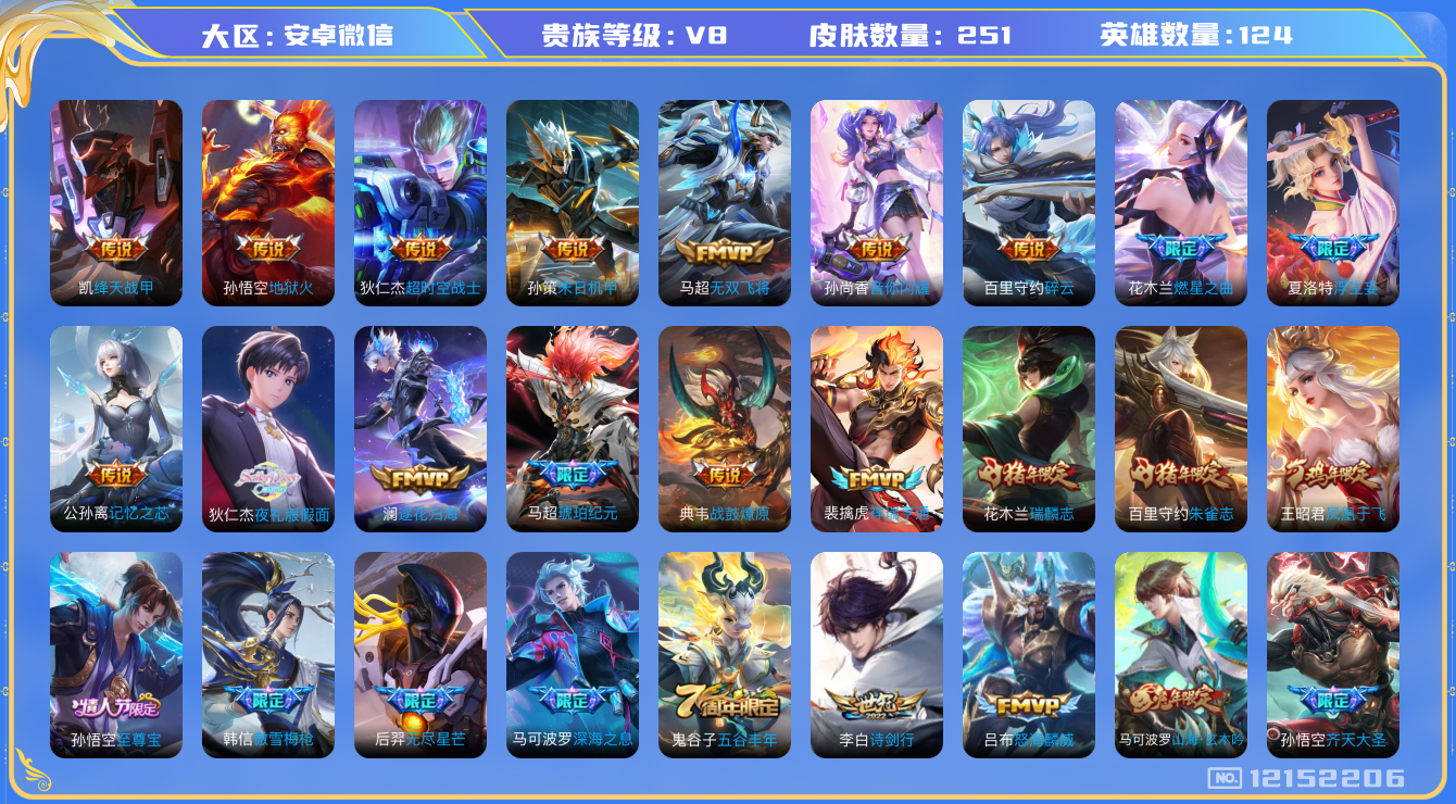 [12152206]【商品标题】:安卓WX-V8-永恒钻石II段位-125英雄-251皮肤-0典藏-0珍品无双-0无双-0珍品传说-22传说-66史诗