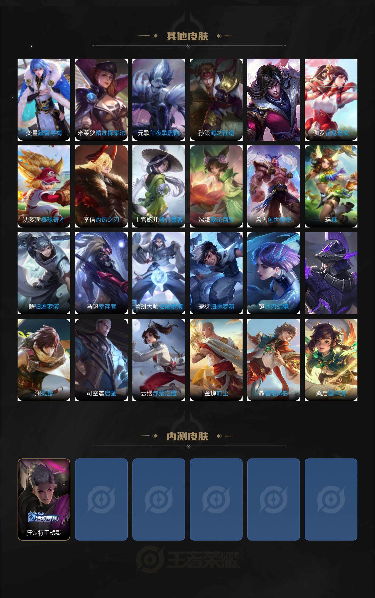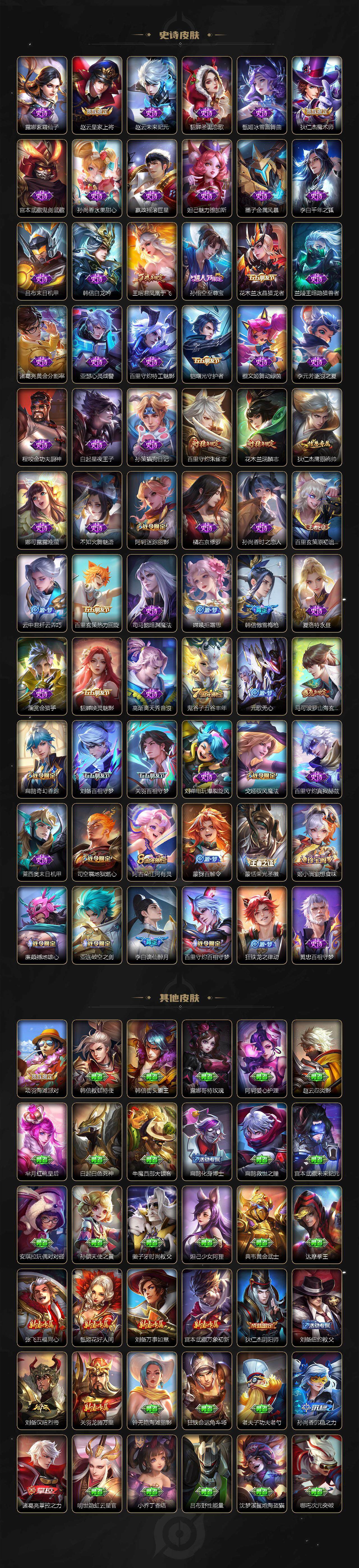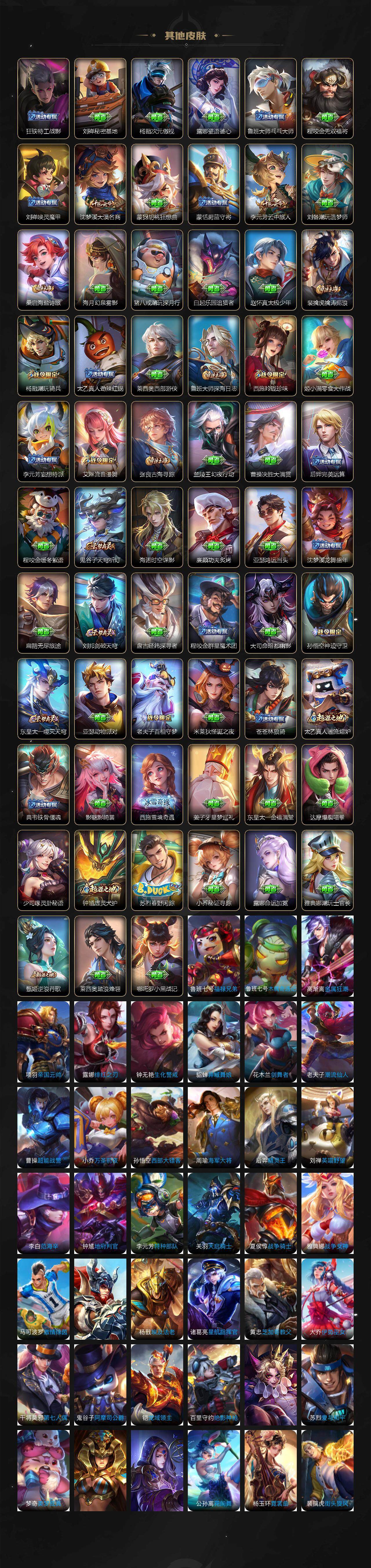 【限定皮肤】:李白谪仙醉月,狄仁杰阴阳师,赵云皇家上将,阿轲迷踪丽影,扁鹊奇幻香踪,元歌无心,马可波罗深海之息,马可波罗山海玄木吟,狄仁杰魔术师,项羽海滩派对,关羽百相守梦,韩信傲雪梅枪,王昭君凤凰于飞,花木兰瑞麟志,花木兰燃星之曲,孙悟空至尊宝,孙悟空齐天大圣,后羿无尽星芒,刘备百相守梦,李元芳云中旅人,虞姬启明星使,杨戬潮玩骑兵,鬼谷子五谷丰年,百里玄策原初追逐者,百里守约朱雀志,沈梦溪大漠名商,裴擒虎擒涛扼浪,云中君纤云弄巧,嫦娥拒霜思,西施玲珑珍味,鲁班大师探海日志,桑启海盐诗旅,夏洛特浮生妄,戈娅驭风魔法,艾琳流音漫舞,司空震地狱燃心,阿古朵江河有灵,张良古海寻踪,狄仁杰夜礼服假面,蒙犽百解令,蒙恬荣光圣徽,鬼谷子天穹祈灯,马超琥珀纪元,姬小满妄想食味,沈梦溪龙舞盛年,刘邦剑破天穹,程咬金群星魔术团