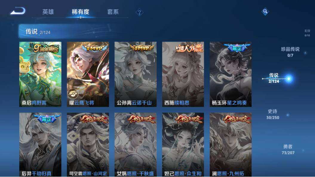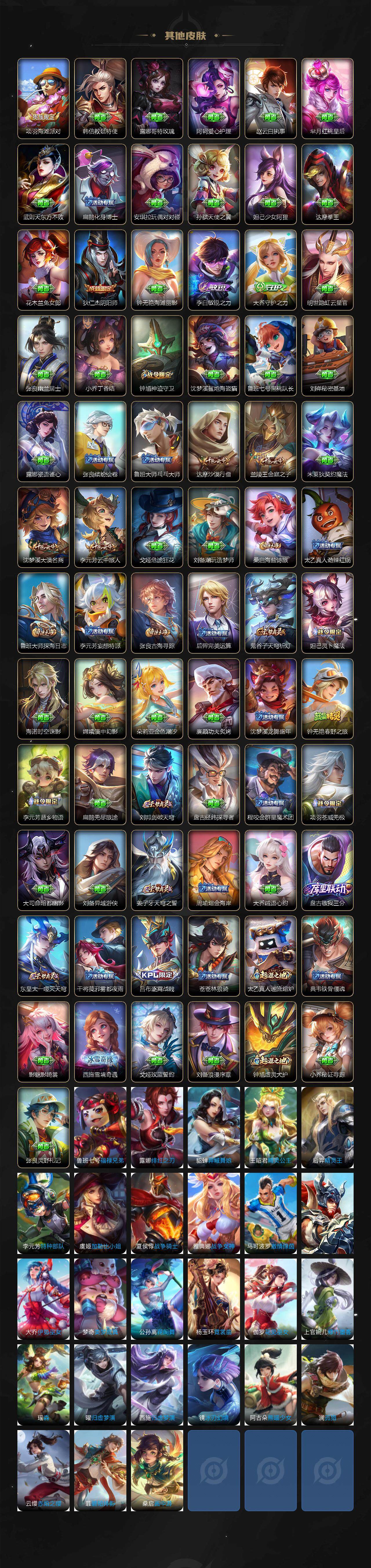 【限定皮肤】:大乔绒语心约,姜子牙天穹之誓,狄仁杰阴阳师,赵云皇家上将,达摩沙漠行僧,项羽海滩派对,兰陵王金庭之子,李元芳云中旅人,钟馗神迹守卫,杨玉环遇见飞天,鬼谷子五谷丰年,沈梦溪大漠名商,云中君纤云弄巧,鲁班大师探海日志,桑启海盐诗旅,阿古朵江河有灵,张良古海寻踪,高渐离燃音魔法,妲己灵卜魔法,鬼谷子天穹祈灯,姬小满妄想食味,沈梦溪龙舞盛年,鲁班七号蔬乡物语,李元芳蔬乡物语,刘邦剑破天穹,上官婉儿群星魔术团,程咬金群星魔术团,镜青焰无极,项羽苍威无极,刘备异域游侠,周瑜熔金海岸