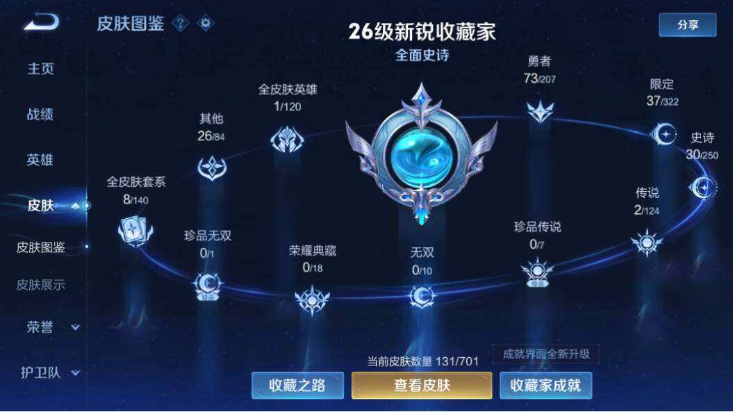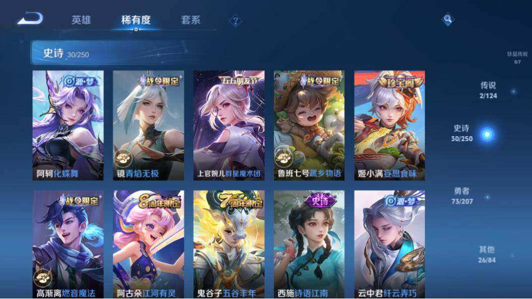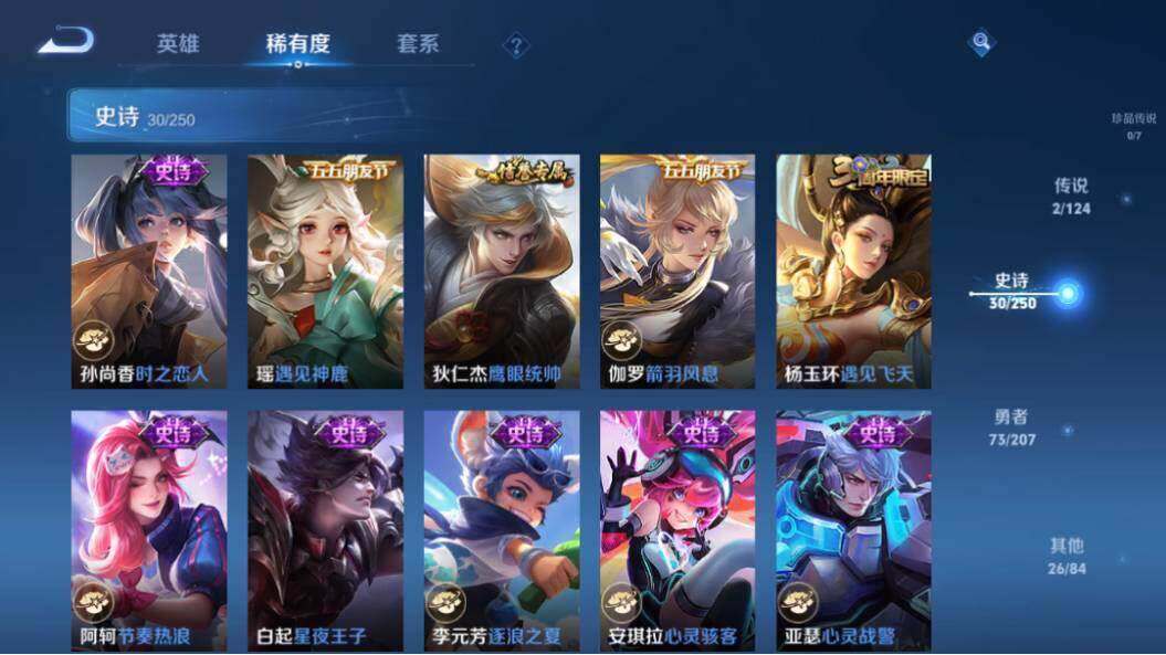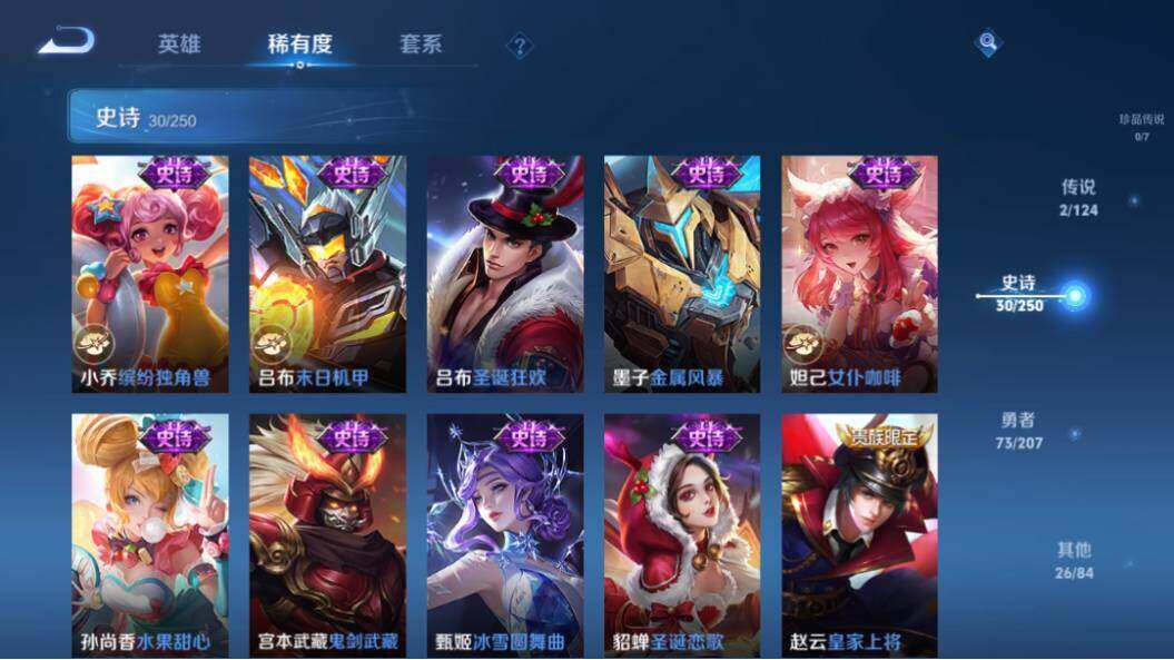 【史诗皮肤】:赵云皇家上将,貂蝉圣诞恋歌,甄姬冰雪圆舞曲,宫本武藏鬼剑武藏,孙尚香水果甜心,妲己女仆咖啡,墨子金属风暴,吕布圣诞狂欢,吕布末日机甲,小乔缤纷独角兽,亚瑟心灵战警,安琪拉心灵骇客,李元芳逐浪之夏,白起星夜王子,阿轲节奏热浪,杨玉环遇见飞天,伽罗箭羽风息,狄仁杰鹰眼统帅,瑶遇见神鹿,孙尚香时之恋人,云中君纤云弄巧,西施诗语江南,鬼谷子五谷丰年,阿古朵江河有灵,妲己灵卜魔法,高渐离燃音魔法,姬小满妄想食味,鲁班七号蔬乡物语,上官婉儿群星魔术团,镜青焰无极,阿轲化蝶舞