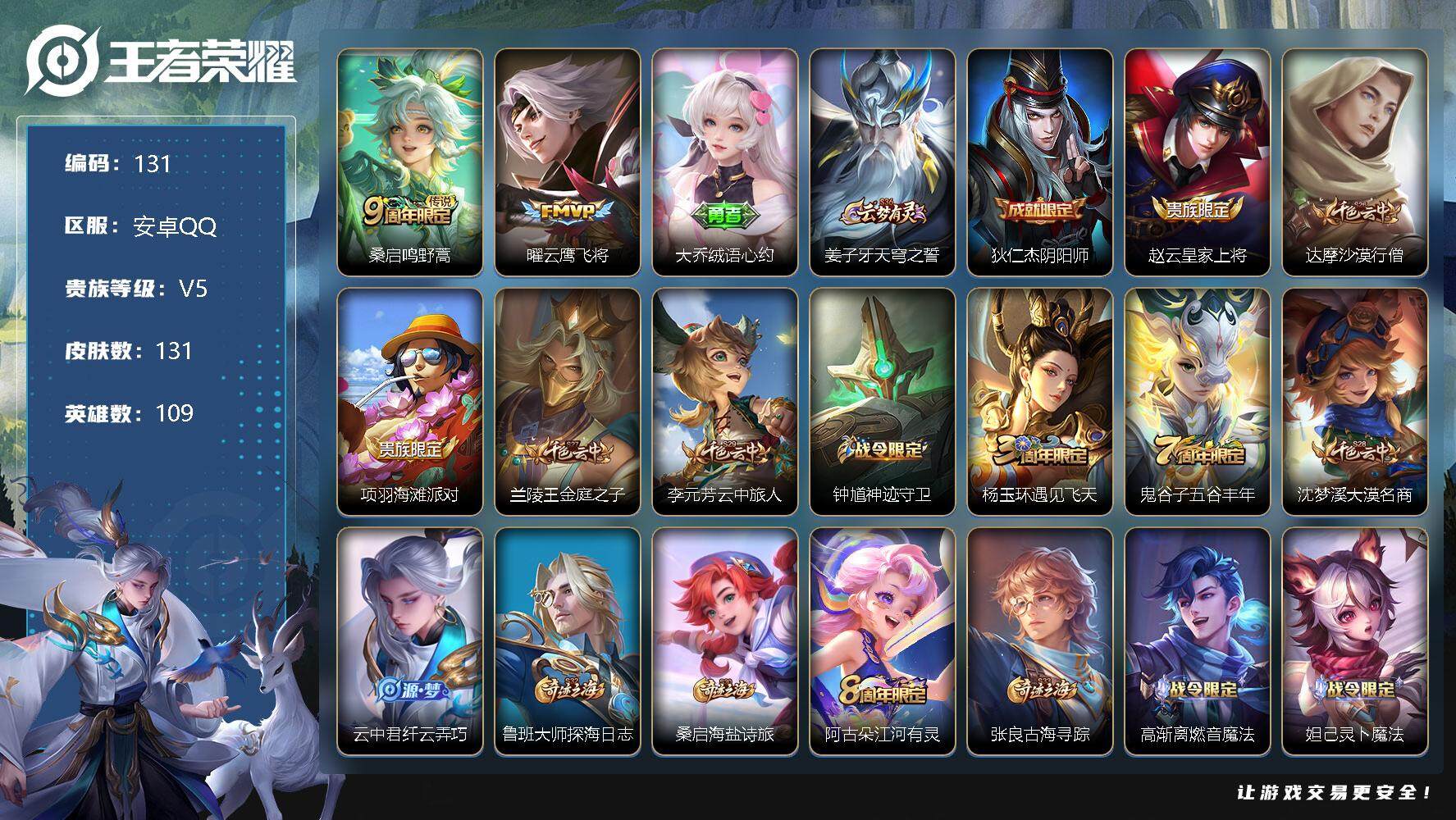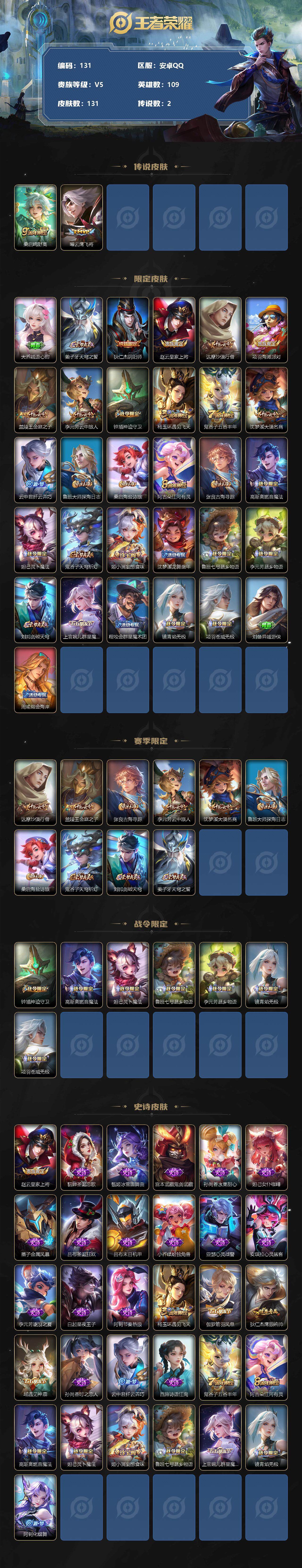 [12151899]【商品标题】:MQ664-安卓Q-V5-永恒钻石III段位-109英雄-131皮肤-0典藏-0珍品无双-0无双-0珍品传说-2传说-30史诗