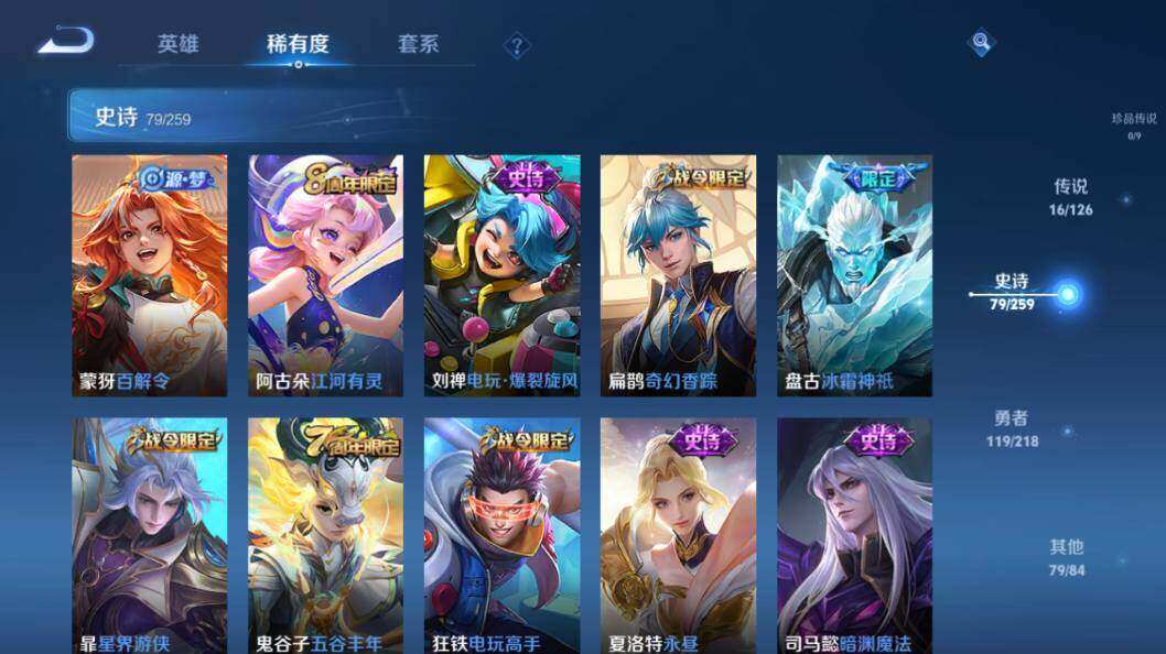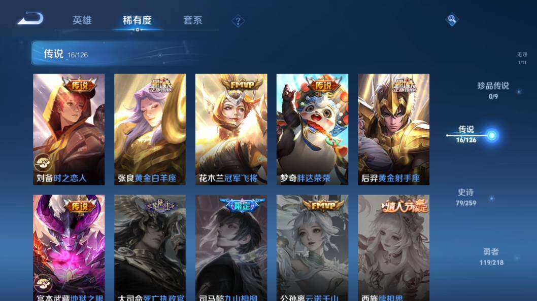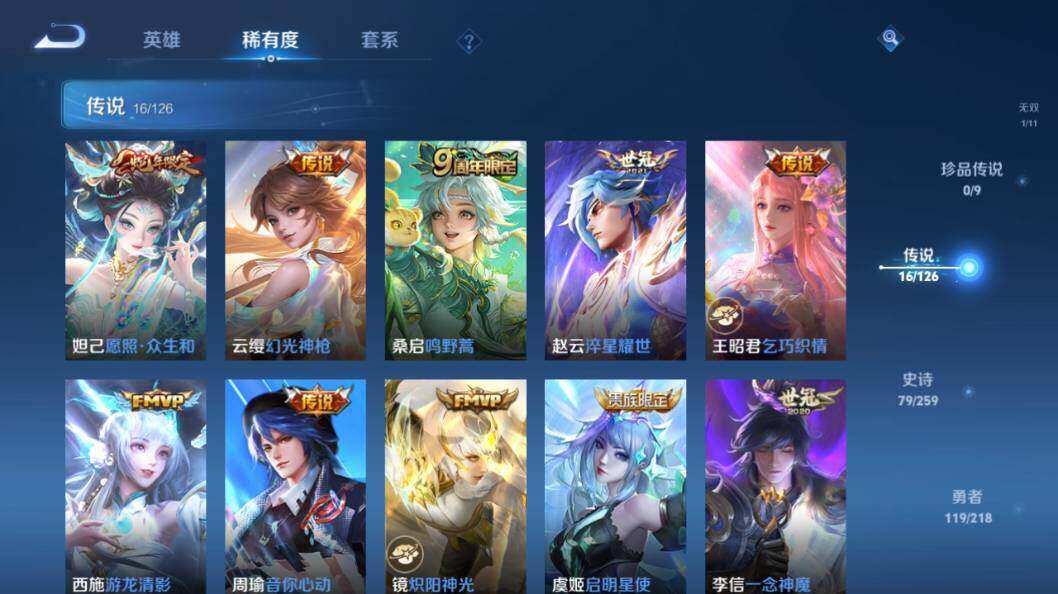 【传说皮肤】:妲己愿照众生和,云缨幻光神枪,桑启鸣野蒿,赵云淬星耀世,王昭君乞巧织情,西施游龙清影,周瑜音你心动,镜炽阳神光,虞姬启明星使,李信一念神魔,刘备时之恋人,张良黄金白羊座,花木兰冠军飞将,梦奇胖达荣荣,后羿黄金射手座,宫本武藏地狱之眼
