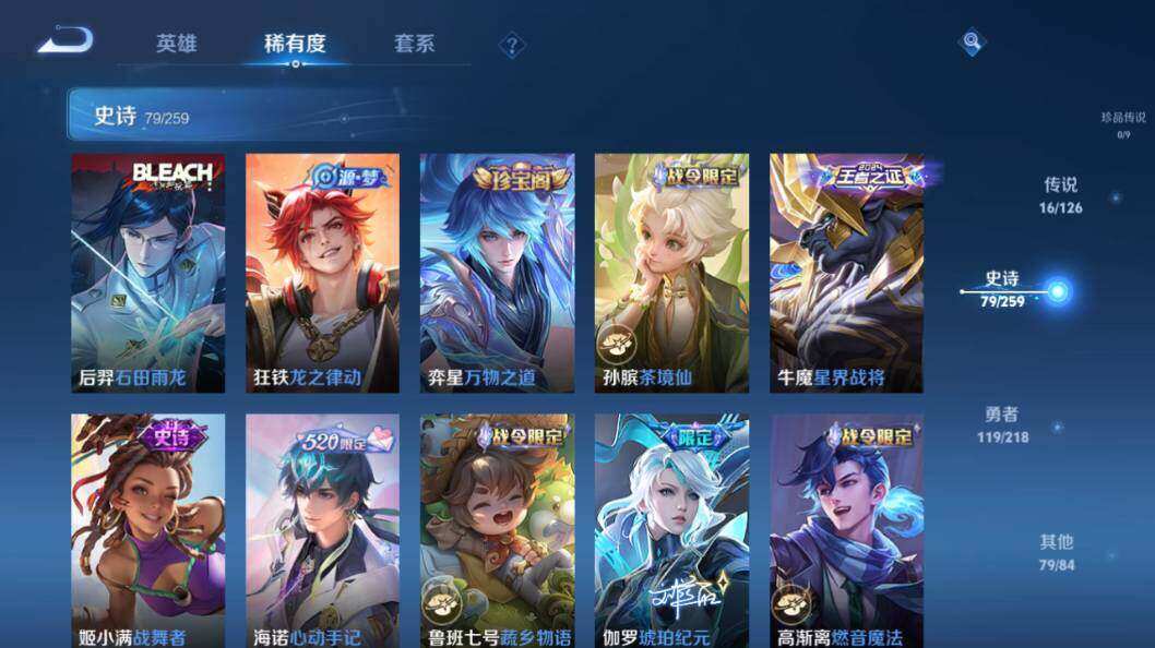 【限定皮肤】:大乔绒语心约,姜子牙天穹之誓,狄仁杰阴阳师,赵云皇家上将,高渐离玩趣恶龙,扁鹊奇幻香踪,吕布御风骁将,甄姬落雪兰心,狄仁杰魔术师,达摩沙漠行僧,项羽海滩派对,安琪拉魔法小厨娘,王昭君午后时光,兰陵王金庭之子,孙悟空至尊宝,后羿辉光之辰,李元芳云中旅人,虞姬启明星使,钟馗驱傩正仪,杨戬潮玩骑兵,女娲朔望之晖,鬼谷子五谷丰年,苏烈千军破阵,百里守约朱雀志,弈星混沌棋,沈梦溪大漠名商,裴擒虎李小龙,裴擒虎擒涛扼浪,狂铁电玩高手,云中君纤云弄巧,猪八戒西部大镖客,嫦娥暖冬兔眠,鲁班大师探海日志,盘古冰霜神祇,桑启海盐诗旅,暃星界游侠,阿古朵江河有灵,张良古海寻踪,蒙犽百解令,高渐离燃音魔法,妲己灵卜魔法,鬼谷子天穹祈灯,伽罗琥珀纪元,沈梦溪龙舞盛年,鲁班七号蔬乡物语,李元芳蔬乡物语,刘邦剑破天穹,海诺心动手记,刘备异域游侠,周瑜熔金海岸