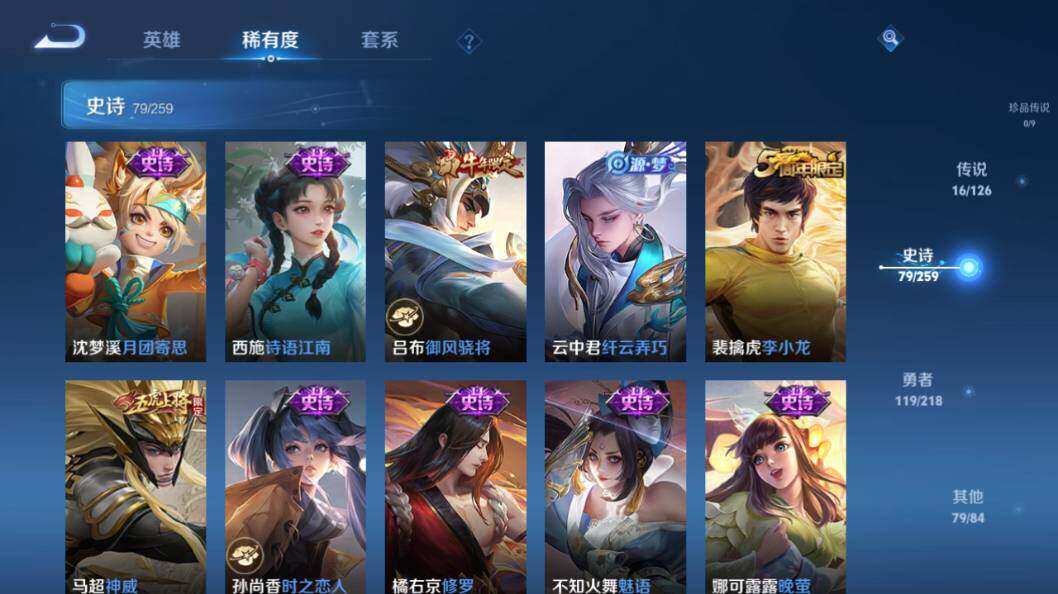 【史诗皮肤】:鲁班七号电玩小子,项羽苍穹之光,露娜紫霞仙子,赵云皇家上将,赵云未来纪元,貂蝉圣诞恋歌,甄姬冰雪圆舞曲,王昭君偶像歌手,狄仁杰魔术师,廉颇地狱岩魂,宫本武藏鬼剑武藏,孙尚香水果甜心,嬴政暗夜贵公子,嬴政摇滚巨星,妲己魅力维加斯,妲己女仆咖啡,墨子龙骑士,墨子金属风暴,吕