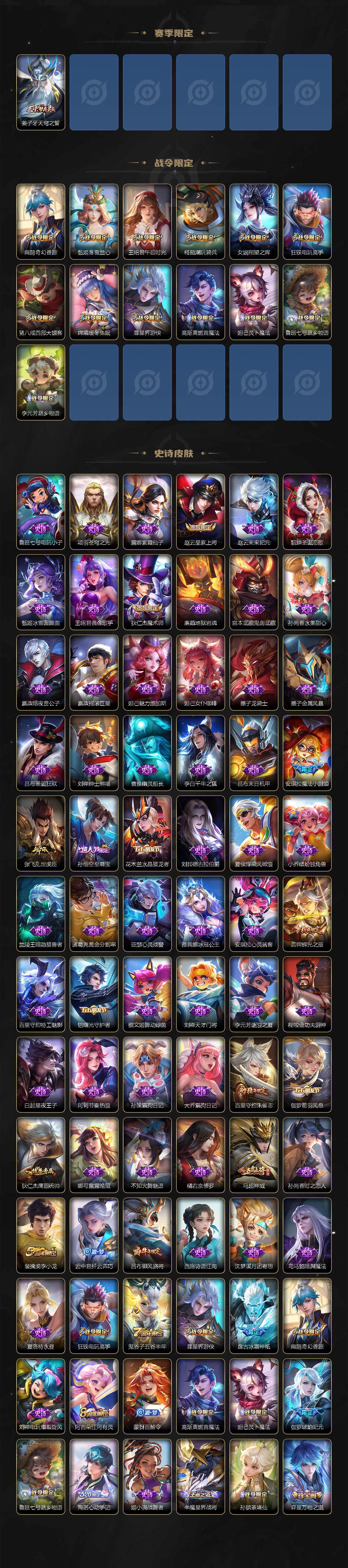 【赛季限定】:达摩沙漠行僧,兰陵王金庭之子,张良古海寻踪,李元芳云中旅人,钟馗驱傩正仪,苏烈千军破阵,弈星混沌棋,沈梦溪大漠名商,裴擒虎擒涛扼浪,鲁班大师探海日志,桑启海盐诗旅,鬼谷子天穹祈灯,刘邦剑破天穹,姜子牙天穹之誓