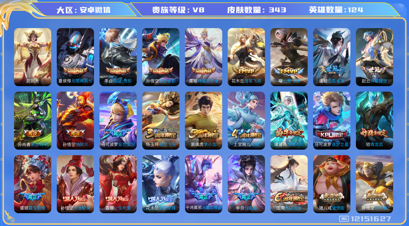 [12151627]AK419 安卓WX-V8-最强王者段位-125英雄-342皮肤-4典藏-0珍品无双-0无双-0珍品传说-11传说-103史诗