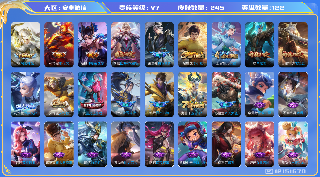 [12151670]AK463安卓WX-V7-至尊星耀II段位-123英雄-245皮肤-0典藏-0珍品无双-0无双-0珍品传说-6传说-64史诗