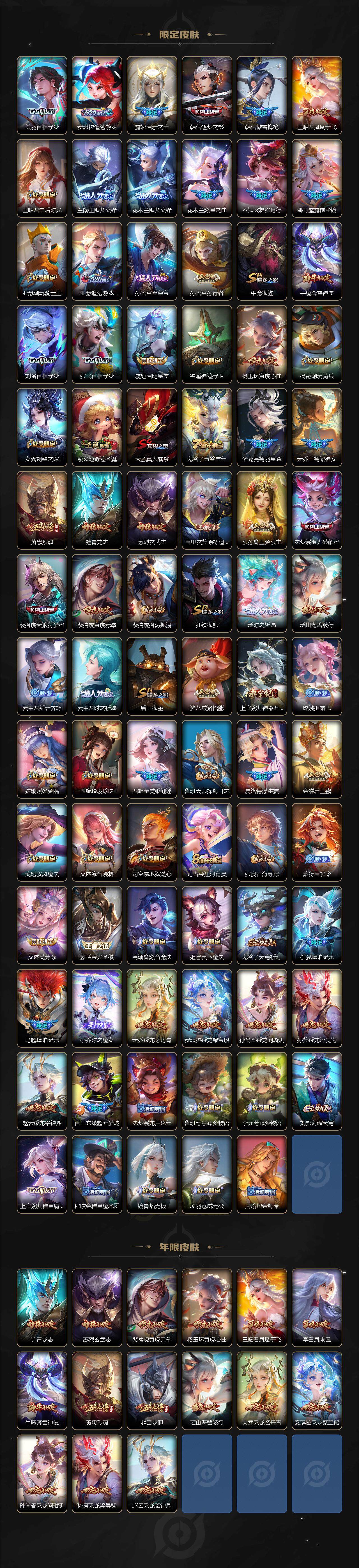【限定皮肤】:白起狰,公孙离离恨烟,夏侯惇霜北刀,暃埋骨钱,蒙犽顽岩魄,蔡文姬夏日便利店,大乔绒语心约,虞姬夏日便利店,姜子牙天穹之誓,李白谪仙醉月,狄仁杰阴阳师,赵云皇家上将,赵云龙胆,孙尚香蔷薇恋人,鲁班七号狮舞东方,孙膑妖精王,扁鹊炼金王,扁鹊奇幻香踪,芈月重明,芈月白晶晶,元歌云间偶戏,甄姬女儿国国王,甄姬落雪兰心,甄姬至美化雀舞,曹操烛龙,典韦穷奇,典韦蓝屏警告,马可波罗妄想实况,狄仁杰魔术师,项羽海滩派对,关羽百相守梦,安琪拉追逃游戏,露娜启示之音,韩信逐梦之影,韩信傲雪梅枪,王昭君凤凰于飞,王昭君午后时光,兰陵王默契交锋,花木兰默契交锋,花木兰燃星之曲,不知火舞绯月行,娜可露露前尘镜,亚瑟潮玩骑士王,亚瑟追逃游戏,孙悟空至尊宝,孙悟空孙行者,牛魔御旌,牛魔奔雷神使,刘备百相守梦,张飞百相守梦,虞姬启明星使,钟馗神迹守卫,杨玉环寅虎心曲,杨戬潮玩骑兵,女娲朔望之晖,蔡文姬奇迹圣诞,太乙真人饕餮,鬼谷子五谷丰年,诸葛亮鹤羽星尊,大乔白鹤梁神女,黄忠烈魂,铠青龙志,苏烈玄