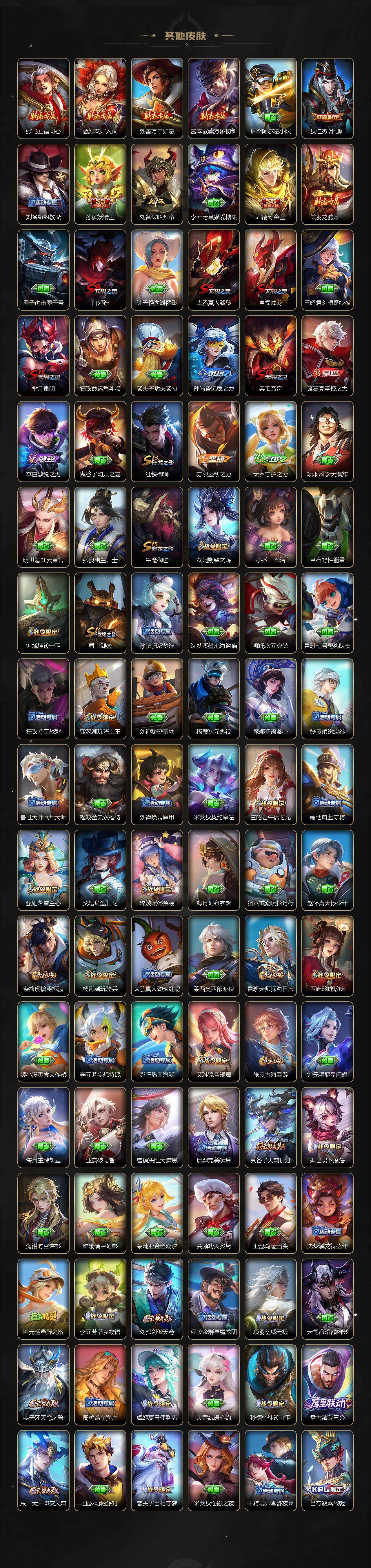 小乔青蛇,大乔白蛇,娜可露露晚萤,伽罗箭羽风息,李元芳逐浪之夏,不知火舞魅语,大乔猫狗日记,孙策猫狗日记,阿轲节奏热浪,露娜紫霞仙子,诸葛亮黄金分割率,王昭君偶像歌手,韩信白龙吟,项羽苍穹之光,阿轲暗夜猫娘,雅典娜冰冠公主,吕布末日机甲,鲁班七号电玩小子,蒙犽龙鼓争鸣,橘右京修罗,墨子龙骑士,嬴政摇滚巨星,刘禅绅士熊喵,刘禅天才门将,白起星夜王子,安琪拉心灵骇客,程咬金功夫厨神,刘邦德古拉伯爵,兰陵王暗隐猎兽者,曹操幽灵船长,宫本武藏鬼剑武藏,亚瑟心灵战警,杨戬天秀·启明,蔡文姬舞动绿茵,廉颇地狱岩魂,西施诗语江南,小乔缤纷独角兽,夏侯惇乘风破浪,花木兰水晶猎龙者,铠曙光守护者,百里玄策热力回旋,墨子金属风暴,百里玄策原初追逐者,吕布圣诞狂欢,貂蝉圣诞恋歌,百里守约特工魅影,嬴政暗夜贵公子,嫦娥拒霜思,李白千年之狐,哪吒雪上飞焰,艾琳奇遇舞章,貂蝉唤灵魅影,庄周天秀·幻梦,刘备百相守梦,关羽百相守梦,沈梦溪匿光破解者,蔡文姬电玩·兔顽号,刘禅电玩·爆裂旋风,莱西奥末日机甲,蒙犽百解令,高渐离燃音魔法,伽罗琥珀纪元,大乔乘龙·忆丹青,安琪拉乘龙·聚宝船,上官婉儿群星魔术团,李白谪仙醉月