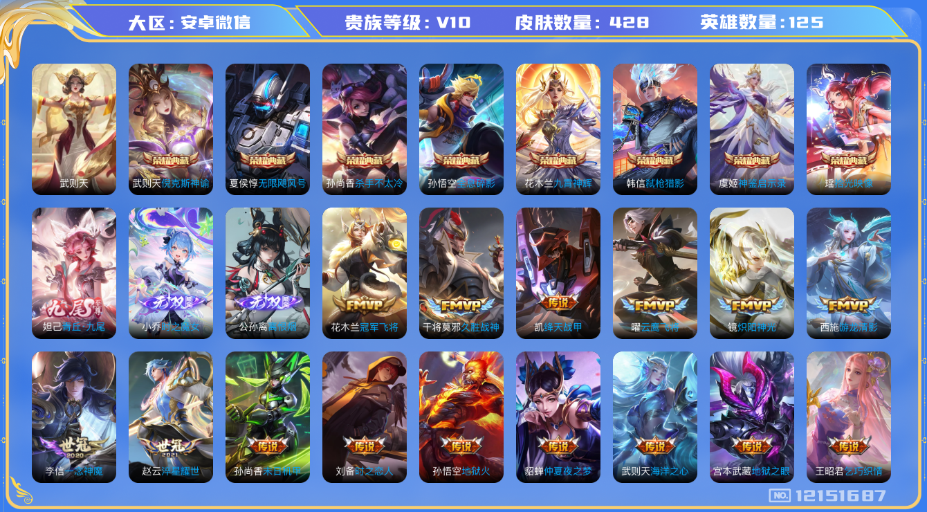 - [11796917]V8 3典藏 11传说 124英雄 343皮肤 可修改实名 优质装备:鸣剑·曳影,全息碎影(猴子典藏),最初的交响(伽罗典藏),云鹰飞将(小将军),一念神魔,仲夏夜之梦(大飞蛾),地狱之眼,淬星耀世,无双飞将 珍宝阁皮:女武神,玩趣恶龙 限定皮:鸣野蒿,至尊宝,凤凰于飞,太华(伽罗年限),白晶晶,时雨天司(水龙头),遇见飞天,匿光决锋者,五谷丰年,冰锋战神,游园惊梦,梁祝,御风骁将(吕布年限),祈雪灵祝(雪兔子),李小龙,霸王别姬-虞姬,圣诞老人,默契交锋-花木兰,孙行者,大圣娶亲,冰霜恋舞曲 史诗皮:赞萌露比,龙之律动,石田雨龙,百相守梦-周瑜,怒海争锋,蔬乡物语(鲁班七号),百相守梦-百里守约,紫霞仙子,电玩小子(小书包),白龙吟,黄金分割率,特工魅影,千年之狐,雪夜绮愿(周瑜),魅语,百解令(蒙犽),高渐离燃音魔法,冰冠公主,偶像歌手,晚萤,末日机甲-吕布,猫狗日记-孙策,猫狗日记-大乔,时之恋人-孙尚香,乱世虎臣,节奏热浪,修罗,女仆咖啡,摇滚巨星,水果甜心,绅士熊喵,星夜王子,心灵骇客,功夫厨神,德古拉伯爵,暗隐猎兽者,鬼剑武藏,心灵战警,天秀·启明,舞动绿茵,地狱岩魂,诗语江南,纤云弄巧,繁星吟游(呼啦呼啦),拒霜思,缤纷独角兽,乘风破浪,逐浪之夏,水晶猎龙者,曙光守护者,箭羽风息,金属风暴,原初追逐者,圣诞狂欢,圣诞恋歌,鹰眼统帅,暗夜贵公子,魅力维加斯,黎明之约,赏金猎手,无心,未来纪元-赵云