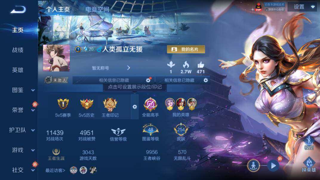 - [6856406]实名: 不可修改 贵族等级: V7 英雄数: 121 皮肤数: 190 传说皮: 云鹰飞将,仲夏夜之梦,霜月吟,典韦战鼓燎原,玄雷天君,幻光神枪 限定皮: 冰锋战神,李小龙,祈雪灵祝,游园惊梦,御风骁将,武圣,飞衡,至尊宝,五谷丰年,影龙天霄,愿照·山河定,愿照·九州拓