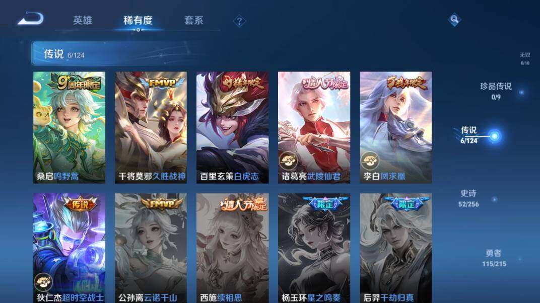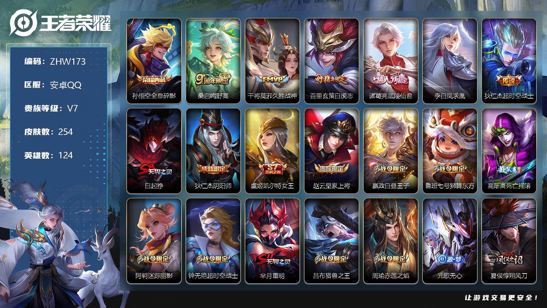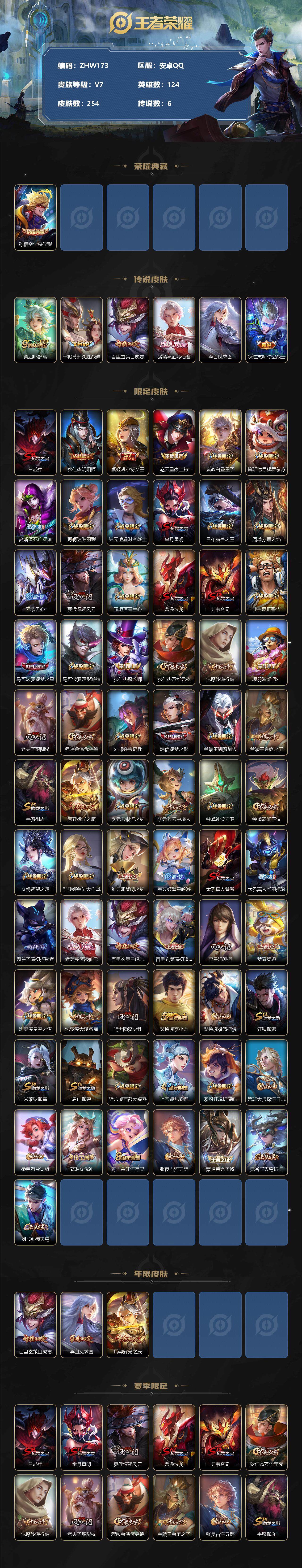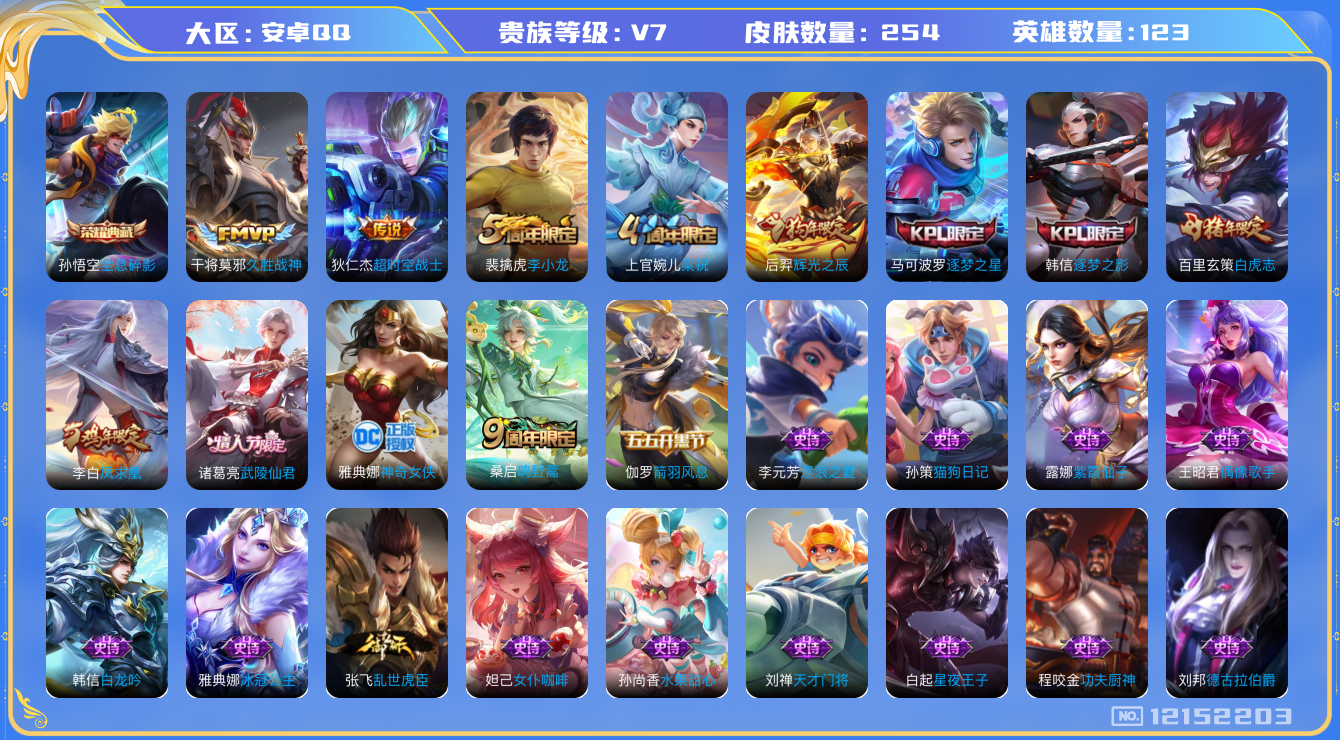 [12152203]【商品标题】:安卓Q-V7-至尊星耀I段位-124英雄-254皮肤-1典藏-0珍品无双-0无双-0珍品传说-6传说-51史诗