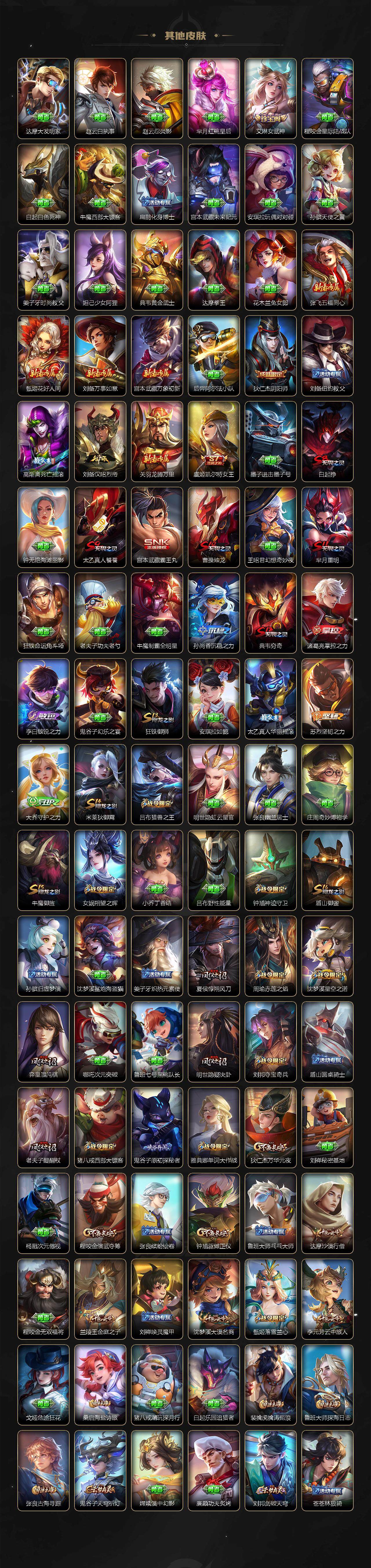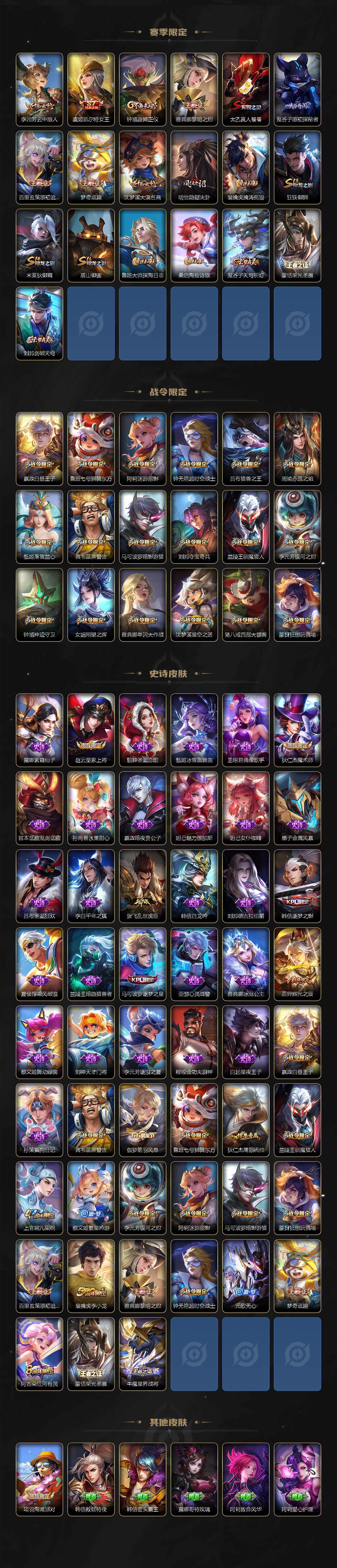 【限定皮肤】:白起狰,狄仁杰阴阳师,虞姬凯尔特女王,赵云皇家上将,嬴政白昼王子,鲁班七号狮舞东方,高渐离死亡摇滚,阿轲迷踪丽影,钟无艳超时空战士,芈月重明,吕布猎兽之王,周瑜赤莲之焰,元歌无心,夏侯惇朔风刀,甄姬落雪兰心,曹操烛龙,典韦穷奇,典韦蓝屏警告,马可波罗逐梦之星,马可波罗暗影游猎,狄仁杰魔术师,狄仁杰万华元夜,达摩沙漠行僧,项羽海滩派对,老夫子醍醐杖,程咬金演武夺筹,刘邦夺宝奇兵,韩信逐梦之影,兰陵王驯魔猎人,兰陵王金庭之子,牛魔御旌,后羿辉光之辰,李元芳银河之约,李元芳云中旅人,钟馗神迹守卫,钟馗驱傩正仪,女娲朔望之晖,雅典娜单词大作战,雅典娜黎明之约,蔡文姬繁星吟游,太乙真人饕餮,太乙真人华丽摇滚,鬼谷子原初探秘者,诸葛亮武陵仙君,百里玄策白虎志,百里玄策原初追逐者,弈星混沌棋,梦奇顽趣,沈梦溪星空之诺,沈梦溪大漠名商,明世隐疑决卦,裴擒虎李小龙,裴擒虎擒涛扼浪,狂铁御狮,米莱狄御霄,盾山御銮,猪八戒西部大镖客,上官婉儿梁祝,蒙犽狂想玩偶喵,鲁班大师探海日志,桑启海盐诗旅,艾琳女武神,阿古朵江河有灵,张良古海寻踪,蒙恬荣光圣徽,鬼谷子天穹祈灯,刘邦剑破天穹
