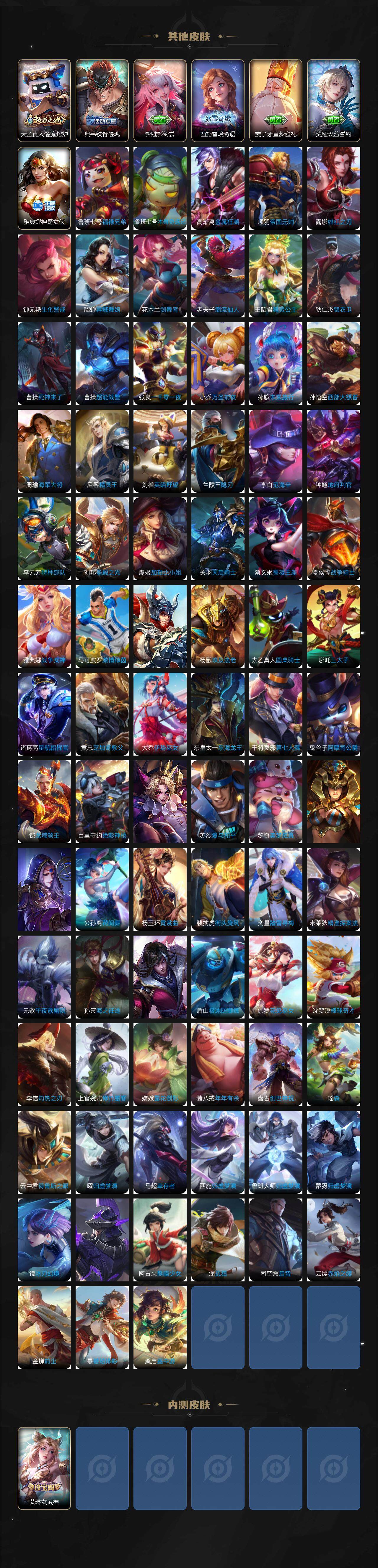 虞姬凯尔特女王,白起狰,太乙真人饕餮,曹操烛龙,芈月重明,典韦穷奇,狂铁御狮,米莱狄御霄,牛魔御旌,夏侯惇朔风刀,明世隐疑决卦,老夫子醍醐杖,鬼谷子原初探秘者,狄仁杰万华元夜,程咬金演武夺筹,钟馗驱傩正仪,吕布猎兽之王,嬴政白昼王子,女娲朔望之晖,典韦蓝屏警告,钟馗神迹守卫,鲁班七号狮舞东方,沈梦溪星空之诺,李元芳银河之约,刘邦夺宝奇兵,马可波罗暗影游猎,蒙犽狂想玩偶喵,弈星混沌棋,达摩沙漠行僧,兰陵王金庭之子,沈梦溪大漠名商,李元芳云中旅人,桑启海盐诗旅,裴擒虎擒涛扼浪,鲁班大师探海日志,张良古海寻踪