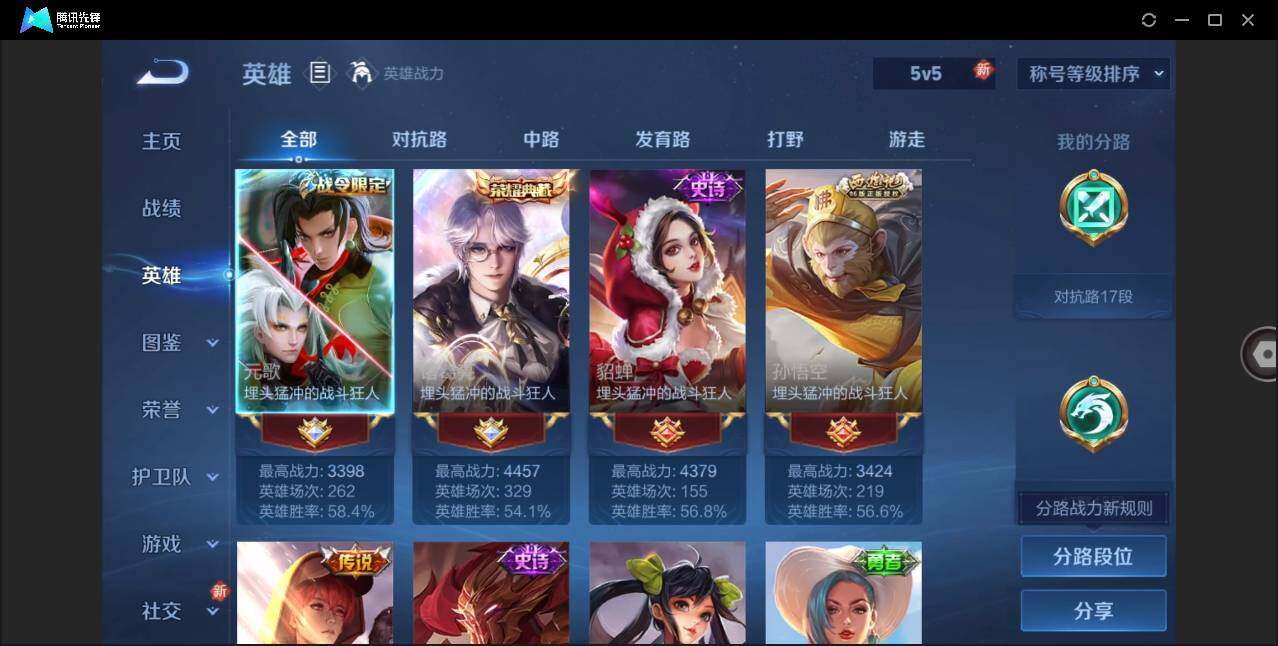 - [11938751]V5 4传说 117英雄 125皮肤 可修改实名 优质装备:地狱之眼,超时空战士-狄仁杰,涂山容容 珍宝阁皮:妄想食味 限定皮:愿照·山河定(司空震年限),鸣野蒿 史诗皮:化蝶舞,星界战将,龙之律动,茶境仙,破空之剑,蒙犽顽岩魄,百相守梦-百里守约,百相守梦-黄忠,黄金分割率,千年之狐,江河有灵,蒙恬荣光圣徽,无限星赏官,节奏热浪,修罗,水果甜心,绅士熊喵,星夜王子,德古拉伯爵,暗隐猎兽者,幽灵船长,鬼剑武藏,舞动绿茵,地狱岩魂,纤云弄巧,乘风破浪,逐浪之夏,水晶猎龙者,金属风暴,原初追逐者,圣诞狂欢,鹰眼统帅,魅力维加斯