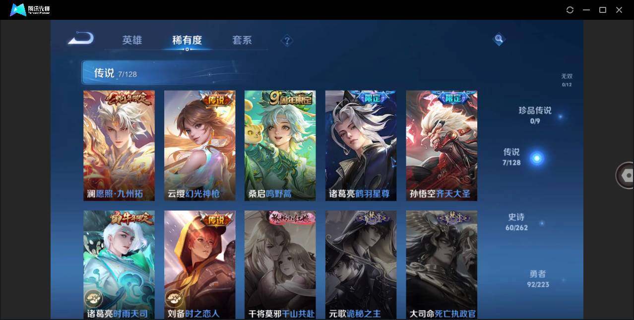 【传说皮肤】:澜愿照九州拓,云缨幻光神枪,桑启鸣野蒿,诸葛亮鹤羽星尊,孙悟空齐天大圣,诸葛亮时雨天司,刘备时之恋人