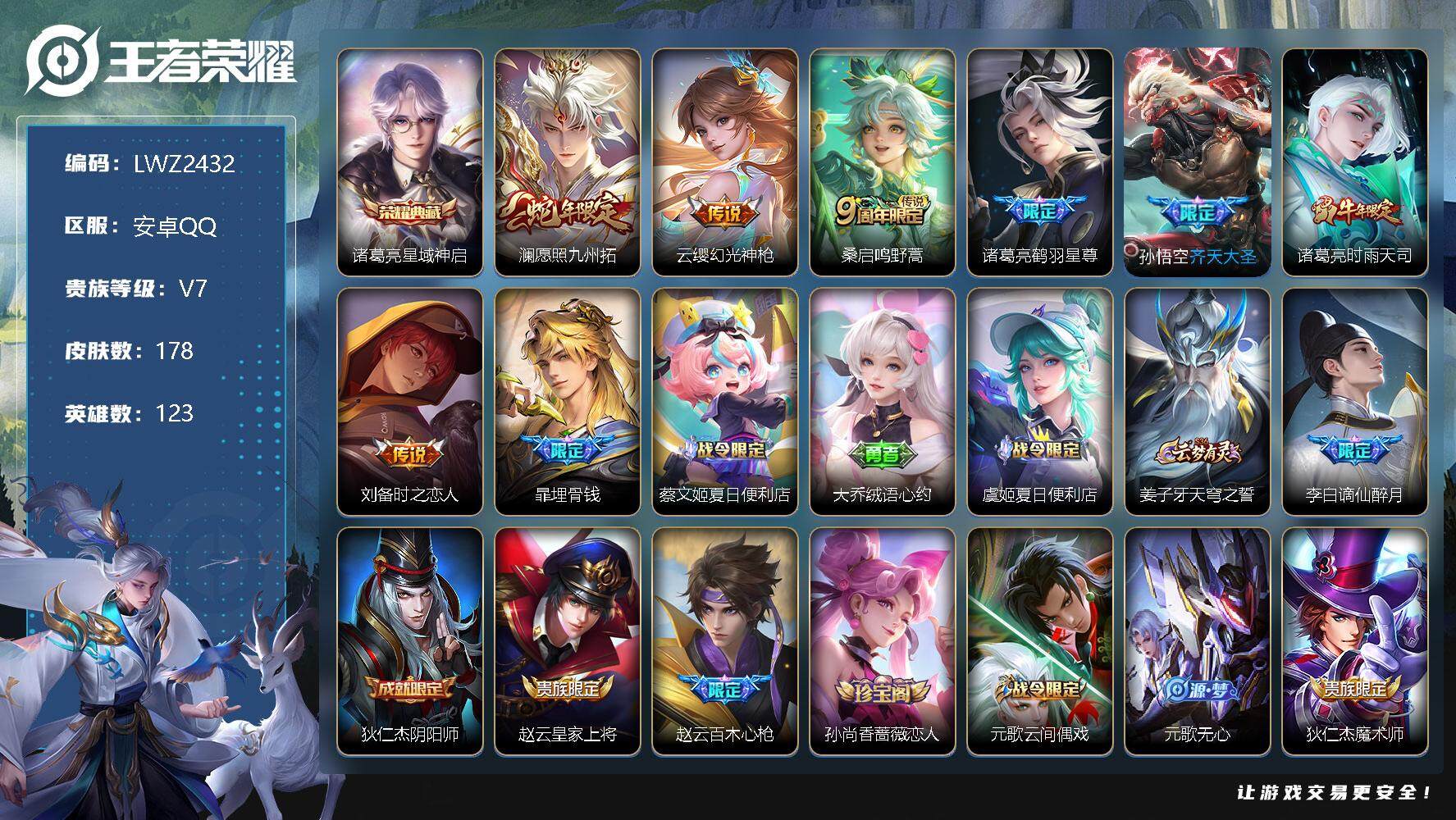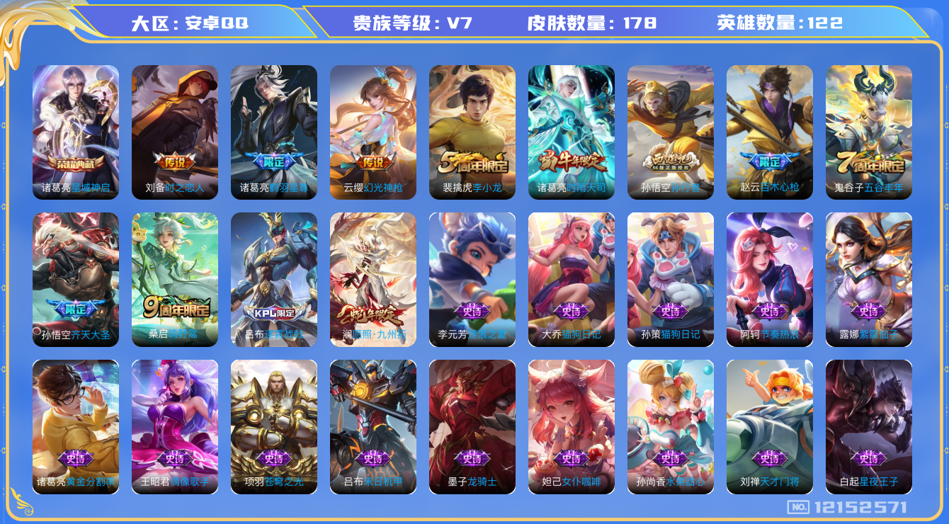 [12152571]【特价急出/详情看图】:安卓Q-V7-最强王者段位-123英雄-178皮肤-1典藏-7传说-60史诗
