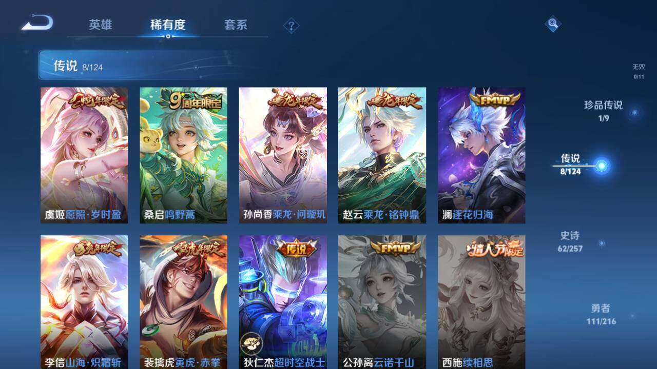 【传说皮肤】:虞姬愿照岁时盈,桑启鸣野蒿,孙尚香乘龙问璇玑,赵云乘龙铭钟鼎,澜逐花归海,李信山海炽霜斩,裴擒虎寅虎赤拳,狄仁杰超时空战士