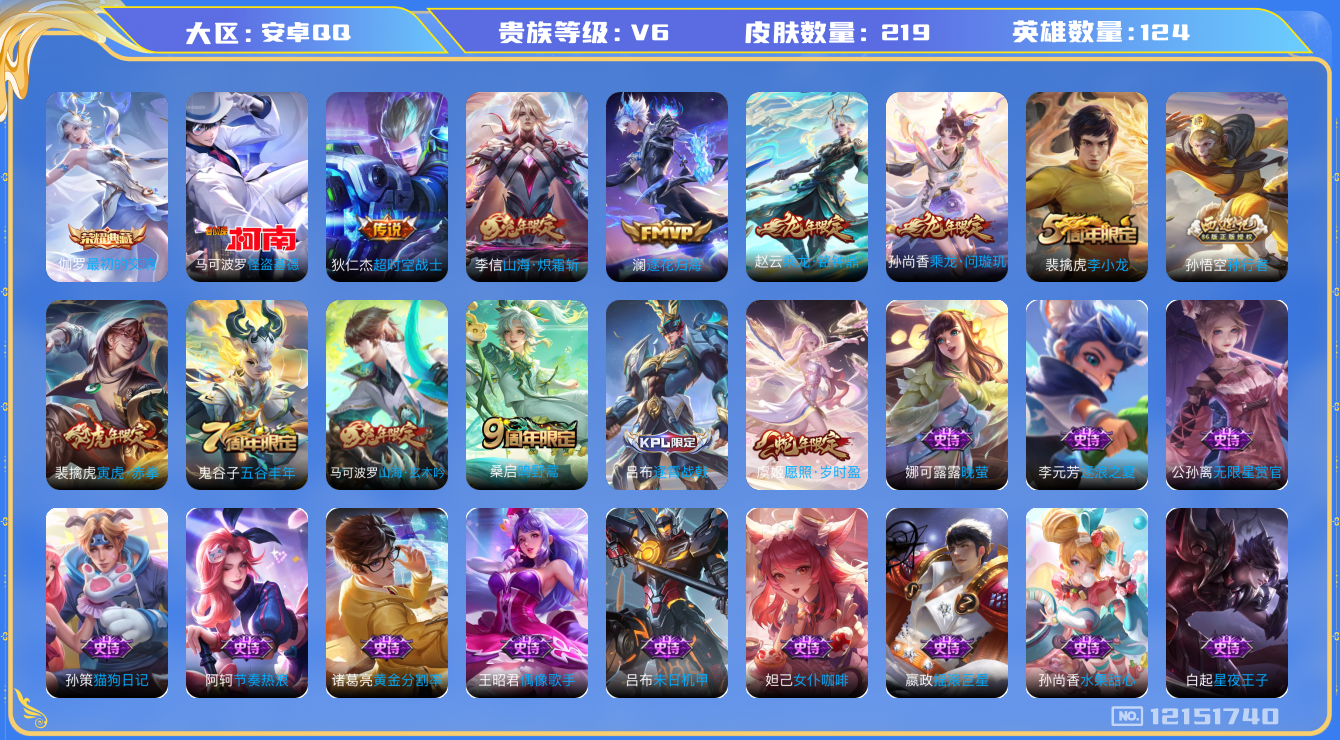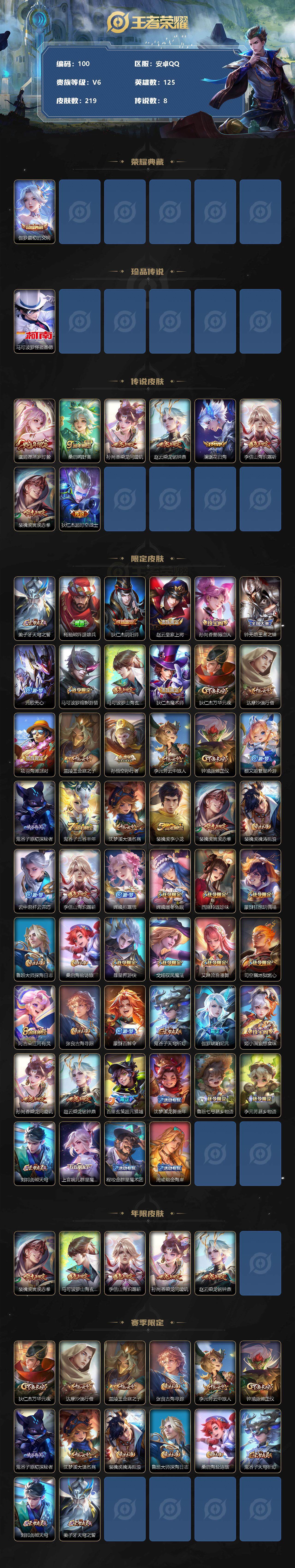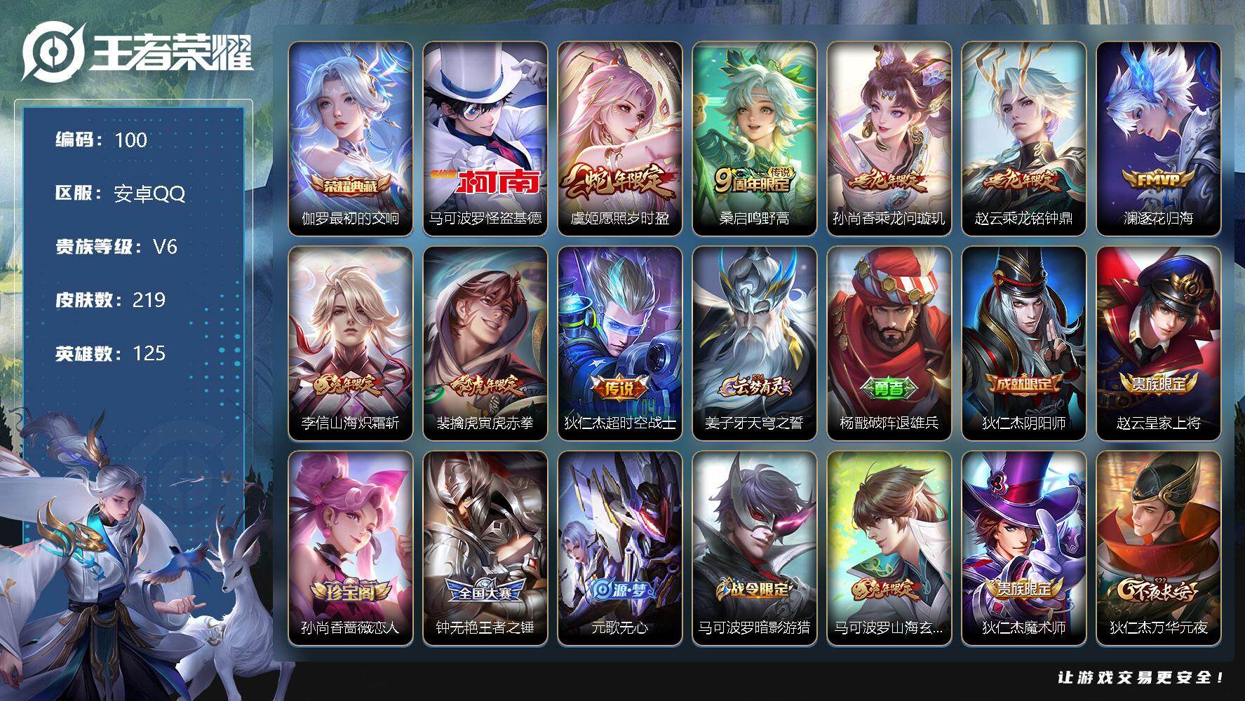 [12151740]【商品标题】:安卓Q-V6-永恒钻石II段位-125英雄-219皮肤-1典藏-0珍品无双-0无双-1珍品传说-8传说-62史诗