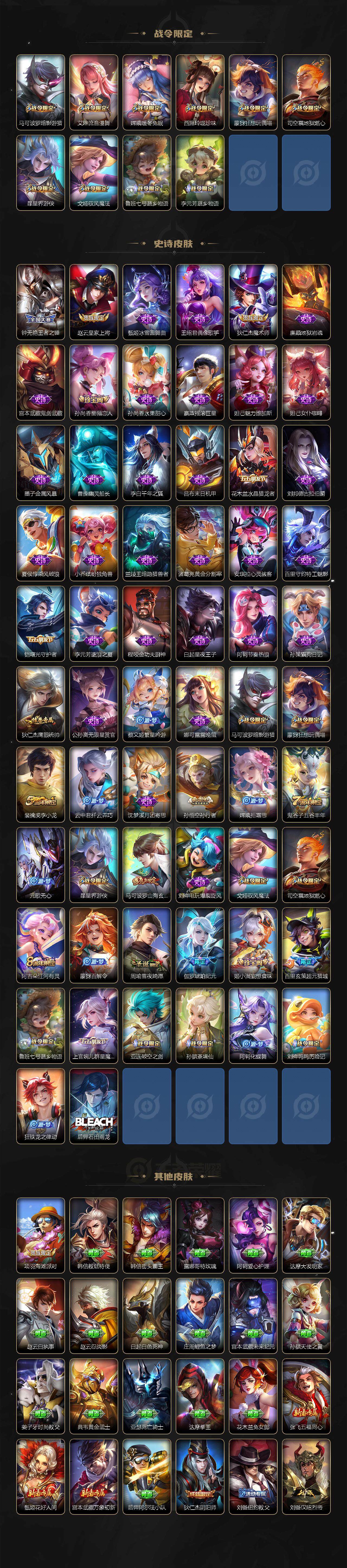 - [11683240]V8 1典藏 15传说 125英雄 359皮肤 可修改实名 优质装备:鸣剑·曳影,云鹰飞将(小将军),地狱火,无双飞将,山海·炽霜斩(李信年限),燃星之曲,百相守梦(张飞),澜逐花归海,琥珀纪元马超 传说皮:乘龙·铭钟鼎(赵云年限),乘龙·淬吴钩(孙策年限),幻光神枪 珍宝阁皮:万物之道,优雅恋人,女武神 限定皮:愿照·山河定(司空震年限),逐霄战戟,鸣野蒿,武陵仙君(小桃花),傲雪梅枪,神威(电光马子),高山流水,匿光决锋者,五谷丰年,青龙志(铠年限),李小龙,猪悟能,匿光追影者,寅虎·御盾(廉颇年限),寅虎·心曲(虎婆),山海·玄木吟(马可年限) 史诗皮:鸭鸭历险记-刘禅,器灵·浮梦炉,化蝶舞,龙之律动,藏狐·褐绒,百相守梦-周瑜,茶境仙,海诺心动手记,破空之剑,战舞者,芈月浮光幕影,怒海争锋,上官婉儿群星魔术团,蔬乡物语(鲁班七号),琥珀纪元伽罗,百相守梦-百里守约,百相守梦-黄忠,紫霞仙子,黄金分割率,特工魅影,千年之狐,永昼,百相守梦(刘备),百相守梦(关羽),江河有灵,雪夜绮愿(周瑜),百解令(蒙犽),高渐离燃音魔法,偶像歌手,暗夜猫娘,魅语,无限星赏官,晚萤,冰冠公主,末日机甲-吕布,猫狗日记-孙策,猫狗日记-大乔,时之恋人-孙尚香,乱世虎臣,节奏热浪,修罗,女仆咖啡,摇滚巨星,水果甜心,绅士熊喵,天才门将,星夜王子,心灵骇客,时之奇旅-安琪拉,德古拉伯爵,暗隐猎兽者,幽灵船长,鬼剑武藏,心灵战警,乐园奇幻夜,舞动绿茵,地狱岩魂,纤云弄巧,拒霜思,缤纷独角兽,乘风破浪,逐浪之夏,水晶猎龙者,曙光守护者,热力回旋,唤灵魅影,金属风暴,圣诞狂欢,圣诞恋歌,鹰眼统帅,魅力维加斯,天秀·音浪,寅虎·御盾,千筹问战,无心,未来纪元-赵云