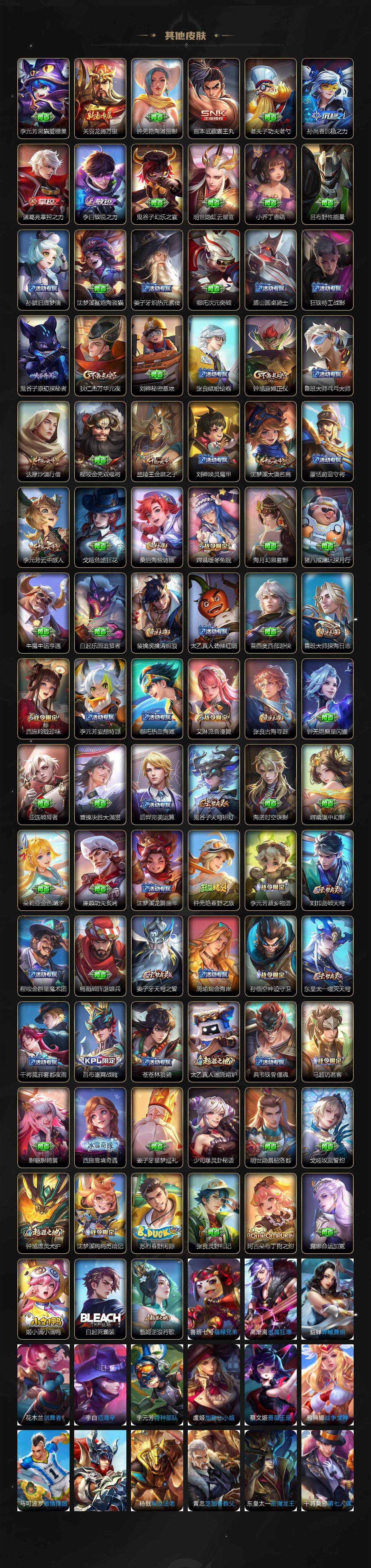 【限定皮肤】:姜子牙天穹之誓,杨戬破阵退雄兵,狄仁杰阴阳师,赵云皇家上将,孙尚香蔷薇恋人,钟无艳王者之锤,元歌无心,马可波罗暗影游猎,马可波罗山海玄木吟,狄仁杰魔术师,狄仁杰万华元夜,达摩沙漠行僧,项羽海滩派对,兰陵王金庭之子,孙悟空孙行者,李元芳云中旅人,钟馗驱傩正仪,蔡文姬繁星吟游,鬼谷子原初探秘者,鬼谷子五谷丰年,沈梦溪大漠名商,裴擒虎李小龙,裴擒虎寅虎赤拳,裴擒虎擒涛扼浪,云中君纤云弄巧,李信山海炽霜斩,嫦娥拒霜思,嫦娥暖冬兔眠,西施玲珑珍味,蒙犽狂想玩偶喵,鲁班大师探海日志,桑启海盐诗旅,暃星界游侠,戈娅驭风魔法,艾琳流音漫舞,司空震地狱燃心,阿古朵江河有灵,张良古海寻踪,蒙犽百解令,鬼谷子天穹祈灯,伽罗琥珀纪元,姬小满妄想食味,孙尚香乘龙问璇玑,赵云乘龙铭钟鼎,百里玄策超元猎域,沈梦溪龙舞盛年,鲁班七号蔬乡物语,李元芳蔬乡物语,刘邦剑破天穹,上官婉儿群星魔术团,程咬金群星魔术团,周瑜熔金海岸