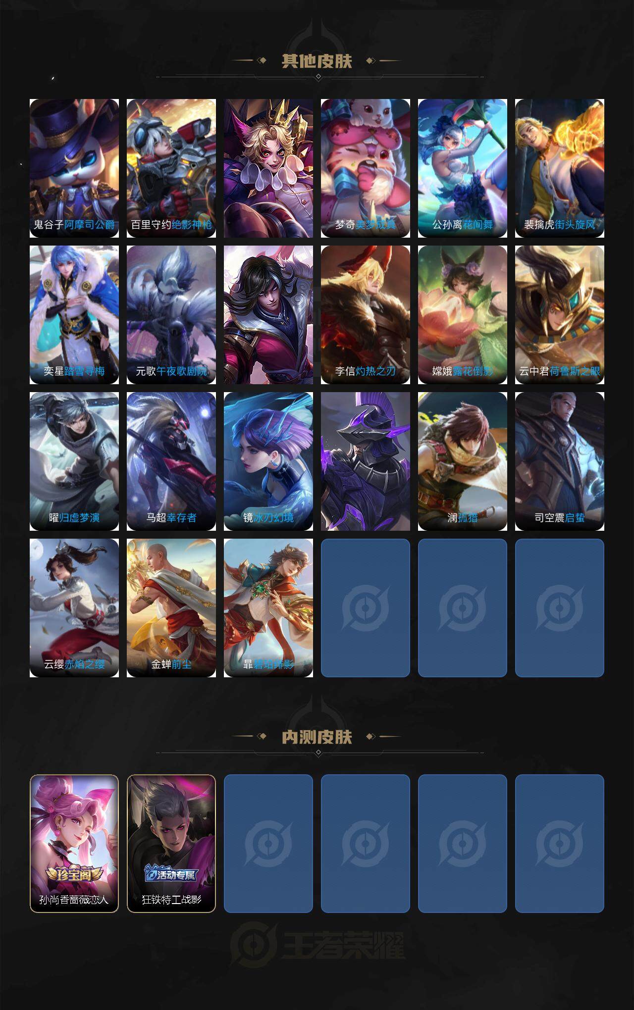 【赛季限定】:狄仁杰万华元夜,达摩沙漠行僧,兰陵王金庭之子,张良古海寻踪,李元芳云中旅人,钟馗驱傩正仪,鬼谷子原初探秘者,沈梦溪大漠名商,裴擒虎擒涛扼浪,鲁班大师探海日志,桑启海盐诗旅,鬼谷子天穹祈灯,刘邦剑破天穹,姜子牙天穹之誓
