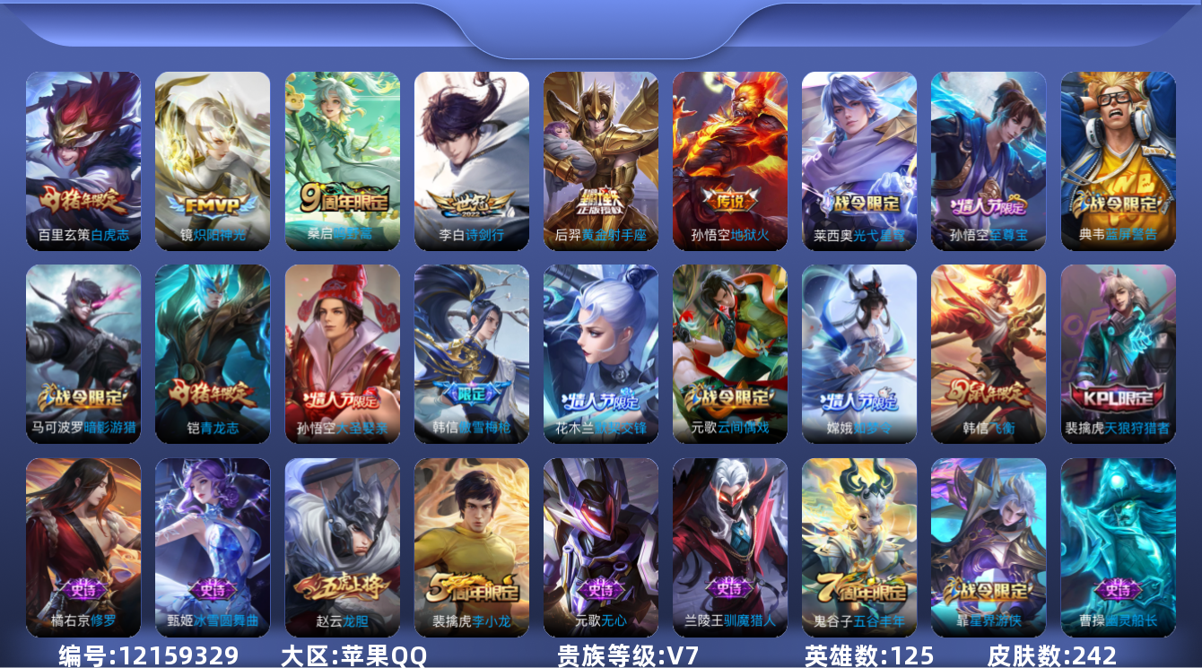 - [11764116]V6 3传说 122英雄 245皮肤 可修改实名 优质装备:地狱火 传说皮:乘龙·铭钟鼎(赵云年限) 珍宝阁皮:妄想食味,蔷薇恋人,玩趣恶龙 限定皮:鸣野蒿,至尊宝,傲雪梅枪,高山流水,五谷丰年,青龙志(铠年限),御风骁将(吕布年限),李小龙,猪悟能 史诗皮:星界战将,琥珀纪元伽罗,蔬乡物语(鲁班七号),紫霞仙子,黄金分割率,特工魅影,千年之狐,雪夜绮愿(周瑜),百解令(蒙犽),高渐离燃音魔法,冰冠公主,末日机甲-吕布,猫狗日记-孙策,猫狗日记-大乔,乱世虎臣,节奏热浪,修罗,女仆咖啡,摇滚巨星,水果甜心,星夜王子,心灵骇客,功夫厨神,暗隐猎兽者,幽灵船长,鬼剑武藏,心灵战警,舞动绿茵,地狱岩魂,纤云弄巧,繁星吟游(呼啦呼啦),拒霜思,缤纷独角兽,乘风破浪,逐浪之夏,月团寄思,水晶猎龙者,曙光守护者,箭羽风息,金属风暴,圣诞恋歌,鹰眼统帅,王者之锤,暗夜贵公子,无心,未来纪元-赵云