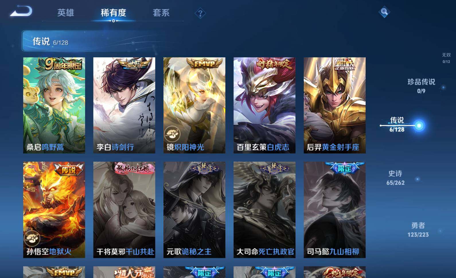 【传说皮肤】:桑启鸣野蒿,李白诗剑行,镜炽阳神光,百里玄策白虎志,后羿黄金射手座,孙悟空地狱火