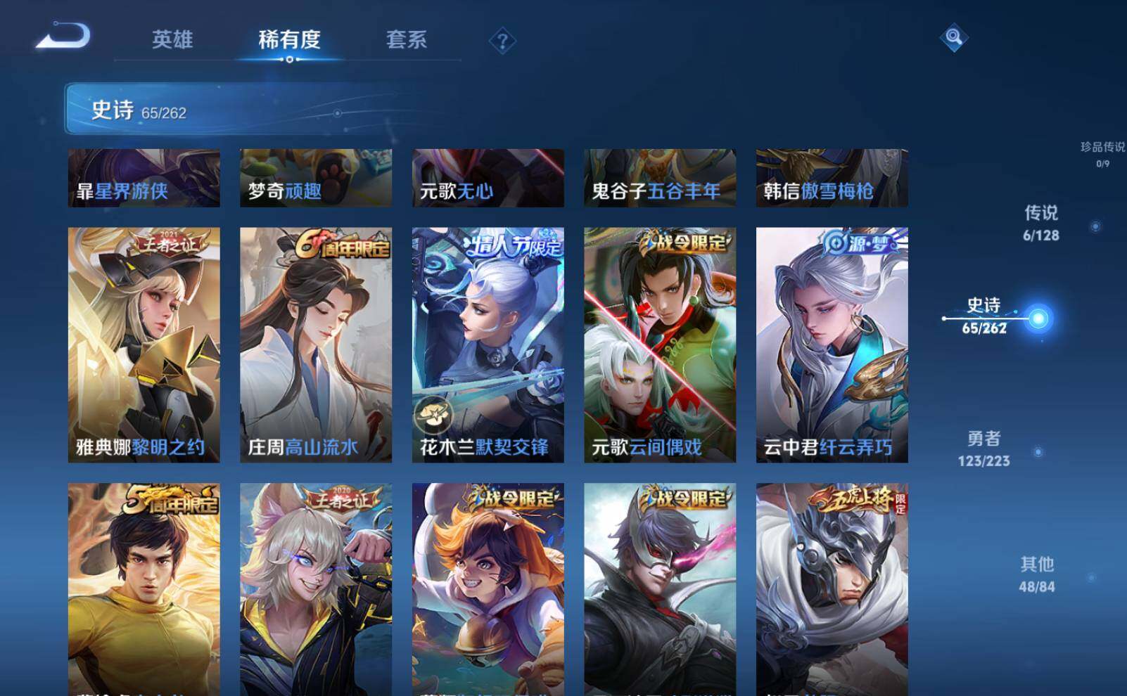 【赛季限定】:庄周蜃楼王,孙膑妖精王,扁鹊炼金王,白起狰,芈月重明,夏侯惇朔风刀,曹操烛龙,典韦穷奇,狄仁杰万华元夜,达摩沙漠行僧,老夫子醍醐杖,程咬金演武夺筹,兰陵王金庭之子,张良古海寻踪,亚瑟狮心王,牛魔御旌,李元芳云中旅人,虞姬凯尔特女王,钟馗驱傩正仪,雅典娜黎明之约,太乙真人饕餮,鬼谷子原初探秘者,百里玄策原初追逐者,弈星混沌棋,梦奇顽趣,沈梦溪大漠名商,明世隐疑决卦,裴擒虎擒涛扼浪,狂铁御狮,米莱狄御霄,盾山御銮,鲁班大师探海日志,桑启海盐诗旅,鬼谷子天穹祈灯,蒙恬荣光圣徽,刘邦剑破天穹,姜子牙天穹之誓
