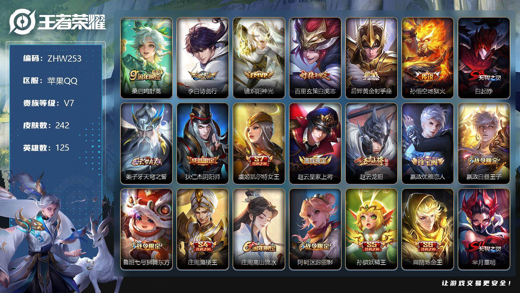 [12159329]打野37段/游走42段【特价急出/详情看图】:苹果Q-V7-永恒钻石I段位-125英雄-242皮肤-6传说-65史诗 【传说皮肤】:桑启鸣野蒿,李白诗剑行,镜炽阳神光,百里玄策白虎志,后羿黄金射手座,孙悟空地狱火 【限定皮肤】:白起狰,姜子牙天穹之誓,狄仁杰阴阳师,虞姬凯尔特女王,赵云皇家上将,赵云龙胆,嬴政优雅恋人,嬴政白昼王子,鲁班七号狮舞东方,庄周蜃楼王,庄周高山流水,阿轲迷踪丽影,孙膑妖精王,扁鹊炼金王,芈月重明,吕布猎兽之王,周瑜赤莲之焰,元歌云间偶戏,元歌无心,夏侯惇朔风刀,甄姬游园惊梦,曹操烛龙,典韦穷奇,典韦蓝屏警告,马可波罗暗影游猎,狄仁杰魔术师,狄仁杰万华元夜,达摩沙漠行僧,项羽海滩派对,老夫子醍醐杖,程咬金演武夺筹,刘邦夺宝奇兵,韩信逐梦之影,韩信飞衡,韩信傲雪梅枪,兰陵王驯魔猎人,兰陵王金庭之子,花木兰默契交锋,亚瑟狮心王,亚瑟潮玩骑士王,孙悟空至尊宝,孙悟空大圣娶亲,牛魔御旌,李元芳银河之约,李元芳云中旅人,钟馗神迹守卫,钟馗驱傩正仪,杨玉环遇见飞天,雅典娜单词大作战,雅典娜黎明之约,蔡文姬繁星吟游,太乙真人饕餮,鬼谷子原初探秘者,鬼谷子五谷丰年,铠青龙志,百里玄策白虎志,百里玄策原初追逐者,弈星混沌棋,梦奇顽趣,沈梦溪星空之诺,沈梦溪大漠名商,明世隐疑决卦,裴擒虎天狼狩猎者,裴擒虎李小龙,裴擒虎擒涛扼浪,狂铁御狮,米莱狄御霄,云中君纤云弄巧,盾山御銮,猪八戒西部大镖客,上官婉儿梁祝,嫦娥如梦令,嫦娥暖冬兔眠,西施玲珑珍味,蒙犽狂想玩偶喵,鲁班大师探海日志,桑启海盐诗旅,暃星界游侠,戈娅驭风魔法,阿古朵江河有灵,张良古海寻踪,蒙恬荣光圣徽,鬼谷子天穹祈灯,刘邦剑破天穹 【年限皮肤】:百里玄策白虎志,铠青龙志,韩信飞衡,赵云龙胆 【赛季限定】:庄周蜃楼王,孙膑妖精王,扁鹊炼金王,白起狰,芈月重明,夏侯惇朔风刀,曹操烛龙,典韦穷奇,狄仁杰万华元夜,达摩沙漠行僧,老夫子醍醐杖,程咬金演武夺筹,兰陵王金庭之子,张良古海寻踪,亚瑟狮心王,牛魔御旌,李元芳云中旅人,虞姬凯尔特女王,钟馗驱傩正仪,雅典娜黎明之约,太乙真人饕餮,鬼谷子原初探秘者,百里玄策原初追逐者,弈星混沌棋,梦奇顽趣,沈梦溪大漠名商,明世隐疑决卦,裴擒虎擒涛扼浪,狂铁御狮,米莱狄御霄,盾山御銮,鲁班大师探海日志,桑启海盐诗旅,鬼谷子天穹祈灯,蒙恬荣光圣徽,刘邦剑破天穹,姜子牙天穹之誓