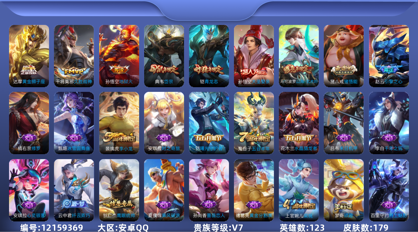 [12159369]打野43段【特价急出/详情看图】:安卓Q-V7-永恒钻石I段位-123英雄-179皮肤-3传说-47史诗