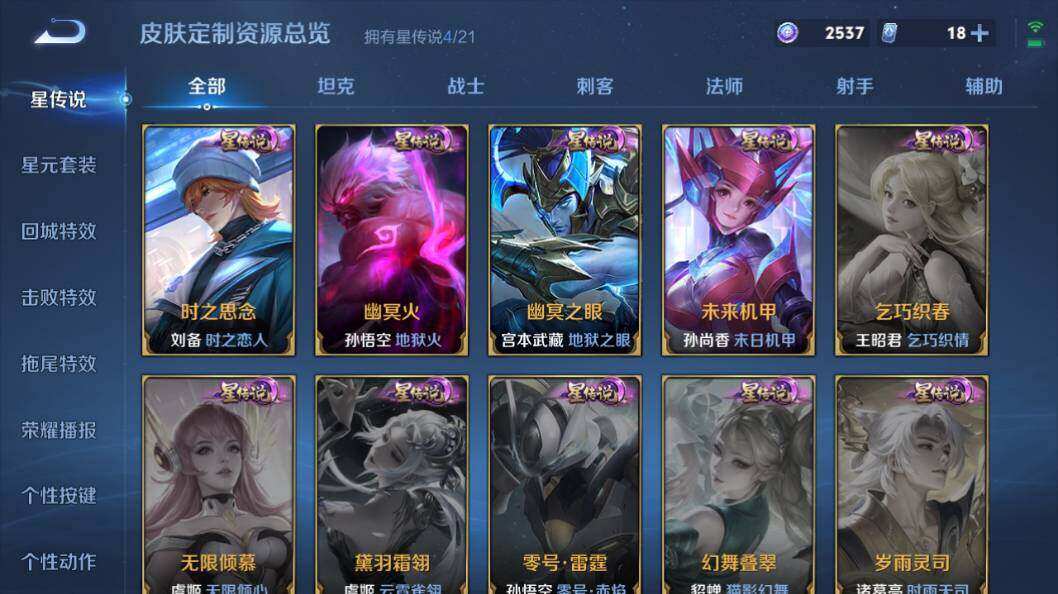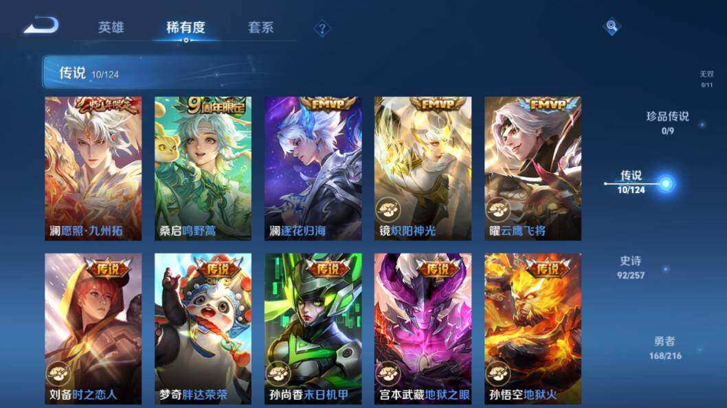 【传说皮肤】:澜愿照九州拓,桑启鸣野蒿,澜逐花归海,镜炽阳神光,曜云鹰飞将,刘备时之恋人,梦奇胖达荣荣,孙尚香末日机甲,宫本武藏地狱之眼,孙悟空地狱火
