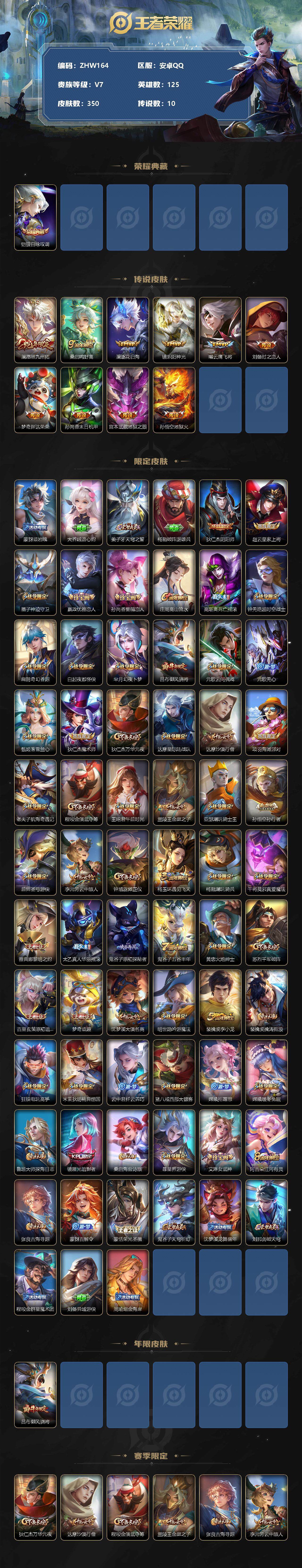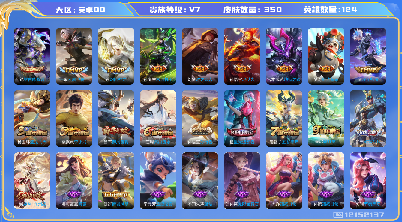 [12152137]【商品标题】:安卓Q-V7-最强王者段位-125英雄-350皮肤-1典藏-0珍品无双-0无双-0珍品传说-10传说-91史诗