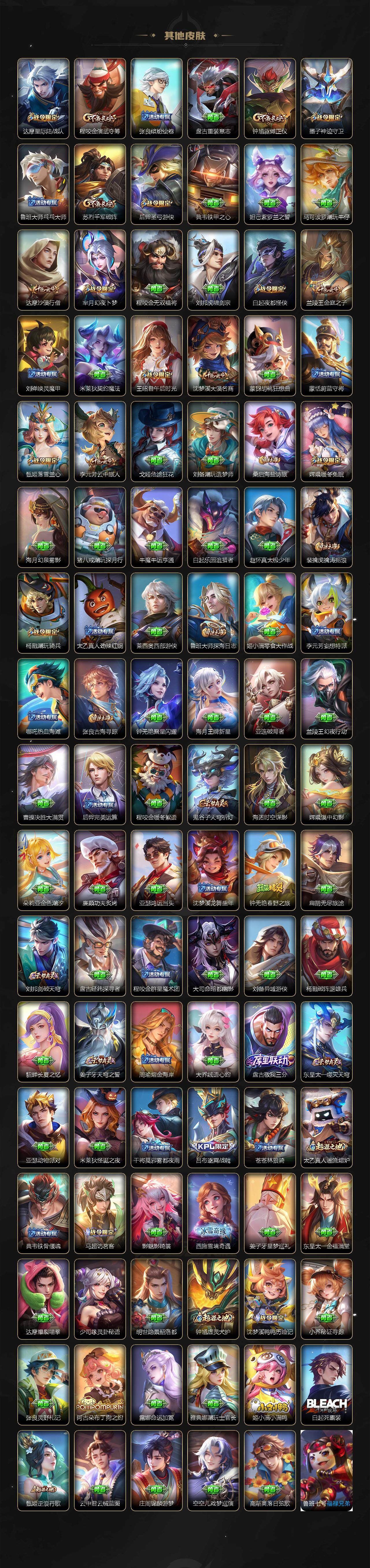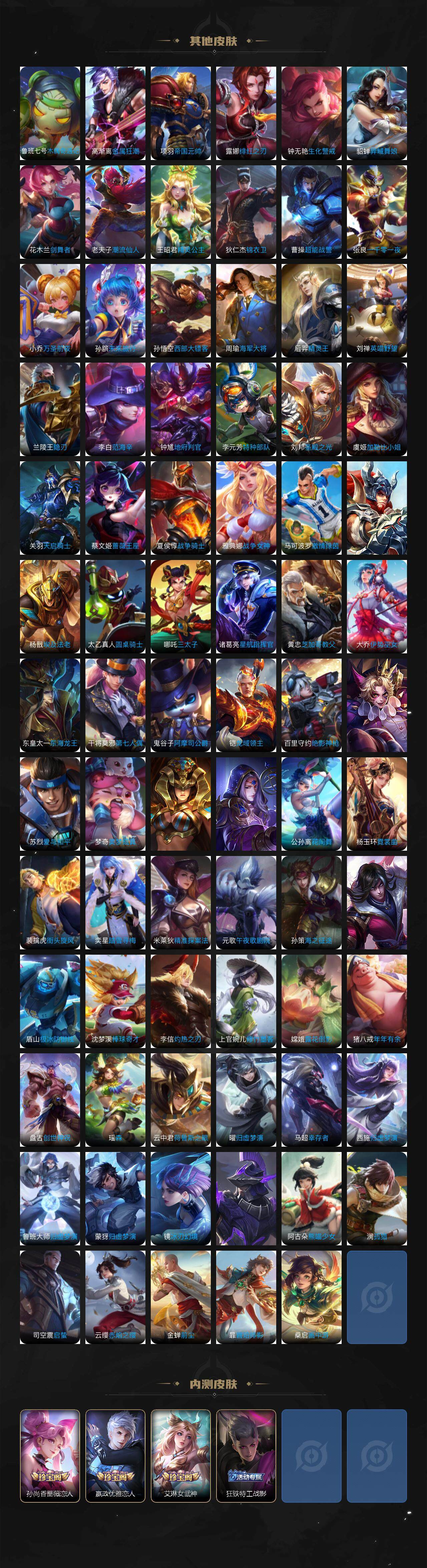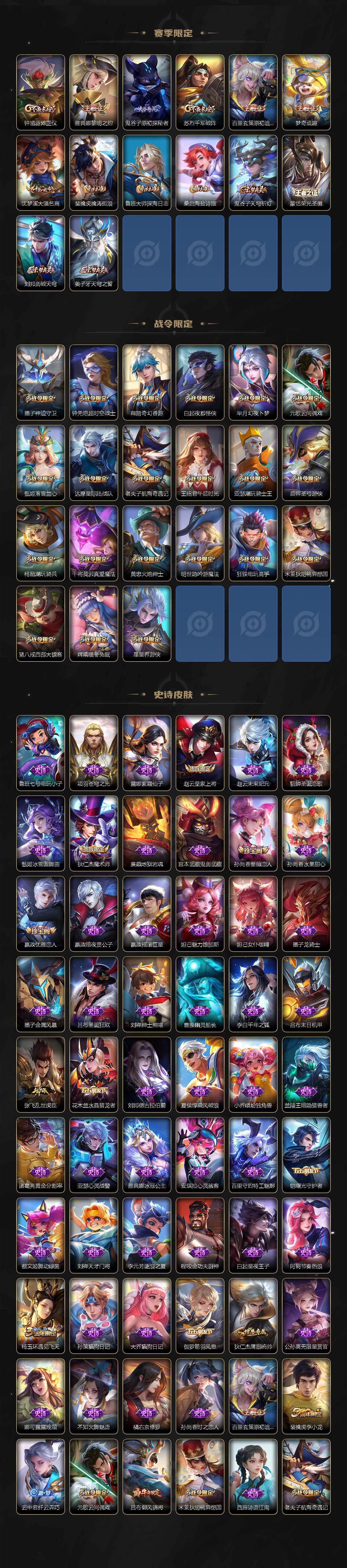 【限定皮肤】:蒙犽顽岩魄,大乔绒语心约,姜子牙天穹之誓,杨戬破阵退雄兵,狄仁杰阴阳师,赵云皇家上将,墨子神迹守卫,嬴政优雅恋人,孙尚香蔷薇恋人,庄周高山流水,高渐离死亡摇滚,钟无艳超时空战士,扁鹊奇幻香踪,白起夜都怪侠,芈月幻夜卜梦,吕布御风骁将,元歌云间偶戏,元歌无心,甄姬落雪兰心,狄仁杰魔术师,狄仁杰万华元夜,达摩星际陆战队,达摩沙漠行僧,项羽海滩派对,老夫子航海奇遇记,程咬金演武夺筹,王昭君午后时光,兰陵王金庭之子,亚瑟潮玩骑士王,孙悟空孙行者,后羿圣弓游侠,李元芳云中旅人,钟馗驱傩正仪,杨玉环遇见飞天,杨戬潮玩骑兵,干将莫邪真爱魔法,雅典娜黎明之约,太乙真人华丽摇滚,鬼谷子原初探秘者,鬼谷子五谷丰年,黄忠火炮绅士,苏烈千军破阵,百里玄策原初追逐者,梦奇顽趣,沈梦溪大漠名商,明世隐吟游魔法,裴擒虎李小龙,裴擒虎擒涛扼浪,狂铁电玩高手,米莱狄胡桃异想国,云中君纤云弄巧,猪八戒西部大镖客,嫦娥拒霜思,嫦娥暖冬兔眠,鲁班大师探海日志,镜匿光追影者,桑启海盐诗旅,暃星界游侠,艾琳女武神,阿古朵江河有灵,张良古海寻踪,蒙犽百解令,蒙恬荣光圣徽,鬼谷子天穹祈灯,沈梦溪龙舞盛年,刘邦剑破天穹,程咬金群星魔术团,刘备异域游侠,周瑜熔金海岸
