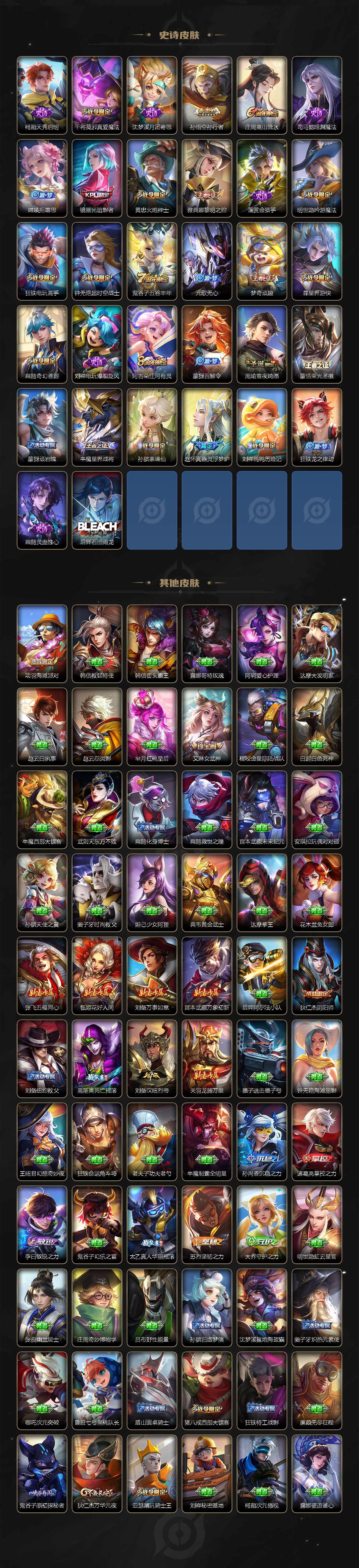 - [12113723]V8 2典藏 1无双 4珍品传说 22传说 125英雄 374皮肤 可修改实名 女号 优质装备:天鹅之梦(小乔典藏),鸣剑·曳影,小乔时之魔女(小乔无双),怪盗基德,器灵·落星盏,酷洛米之心,大耳狗之梦,炽阳神光,零号·赤焰,地狱之眼,李逍遥,末日机甲-孙策,挚爱之约,澜逐花归海,黄金天蝎座,诡秘之主,涂山容容 传说皮:乘龙·铭钟鼎(赵云年限),死亡执政官,星之鸣奏,幻光神枪 珍宝阁皮:妄想食味,优雅恋人,女武神 限定皮:愿照·岁时盈(虞姬年限),愿照·众生和(妲己年限),愿照·千秋盛(女娲年限),鸣野蒿,梅西,异界灵契(白毛香),补天,绯月行,白鹤梁神女,飞衡(韩信年限),玄嵩(庄周年限),遇见飞天,高山流水,五谷丰年,冰锋战神,游园惊梦,梁祝,天狼溯光者,祈雪灵祝(雪兔子),李小龙,霸王别姬-虞姬,孙行者,猪悟能,大圣娶亲,寅虎·御盾(廉颇年限),寅虎·心曲(虎婆),唐三藏,时之奇旅-妲己 史诗皮:赞萌露比,化蝶舞,灵蛊蚀心,星界战将,龙之律动,石田雨龙,幻珠鲛人,怒海争锋,涂山红红,东方月初,百相守梦-百里守约,百相守梦-黄忠,织梦人,守夜人,遇见神鹿,紫霞仙子,苍穹之光,黄金分割率,特工魅影,千年之狐,永昼,江河有灵,浮梦罗烟,魅语,百解令(蒙犽),蒙恬荣光圣徽,冰冠公主,偶像歌手,晚萤,暗夜猫娘,龙骑士(小龙虾),末日机甲-吕布,猫狗日记-孙策,猫狗日记-大乔,时之恋人-孙尚香,乱世虎臣,节奏热浪,修罗,女仆咖啡,摇滚巨星,水果甜心,绅士熊喵,天才门将,星夜王子,心灵骇客,功夫厨神,德古拉伯爵,暗隐猎兽者,幽灵船长,鬼剑武藏,心灵战警,舞动绿茵,地狱岩魂,纤云弄巧,繁星吟游(呼啦呼啦),拒霜思,缤纷独角兽,乘风破浪,逐浪之夏,水晶猎龙者,箭羽风息,金属风暴,原初追逐者,圣诞狂欢,圣诞恋歌,鹰眼统帅,暗夜贵公子,魅力维加斯,黎明之约,雪上飞焰,赏金猎手,奇遇舞章,寅虎·御盾,无心,未来纪元-赵云