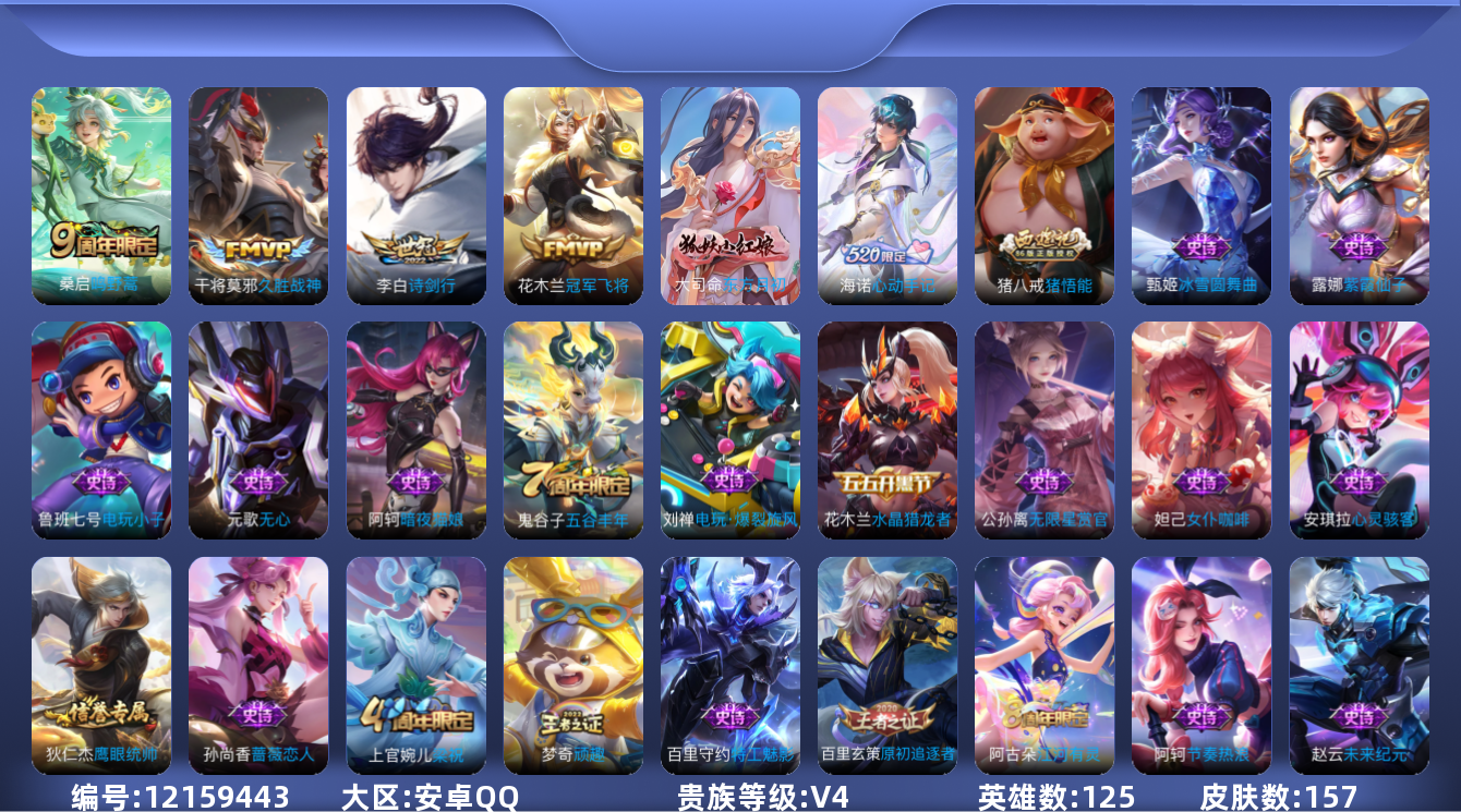 [12159443]【特价急出/详情看图】:安卓Q-V4-永恒钻石III段位-125英雄-157皮肤-4传说-40史诗