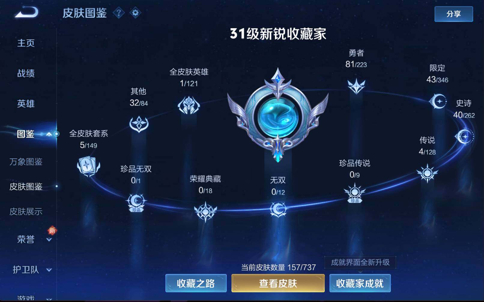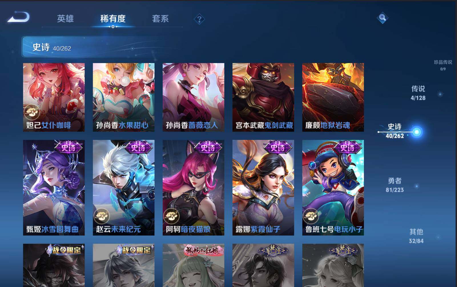 【史诗皮肤】:鲁班七号电玩小子,露娜紫霞仙子,阿轲暗夜猫娘,赵云未来纪元,甄姬冰雪圆舞曲,廉颇地狱岩魂,宫本武藏鬼剑武藏,孙尚香蔷薇恋人,孙尚香水果甜心,妲己女仆咖啡,墨子金属风暴,刘禅绅士熊喵,张飞乱世虎臣,花木兰水晶猎龙者,小乔缤纷独角兽,兰陵王暗隐猎兽者,亚瑟心灵战警,雅典娜冰冠公主,安琪拉心灵骇客,百里守约特工魅影,李元芳逐浪之夏,程咬金功夫厨神,阿轲节奏热浪,伽罗箭羽风息,狄仁杰鹰眼统帅,公孙离无限星赏官,上官婉儿梁祝,百里玄策原初追逐者,猪八戒猪悟能,庄周高山流水,鬼谷子五谷丰年,元歌无心,梦奇顽趣,刘禅电玩爆裂旋风,阿古朵江河有灵,蒙恬荣光圣徽,海诺心动手记,蒙犽顽岩魄,大司命东方月初,牛魔星界战将
