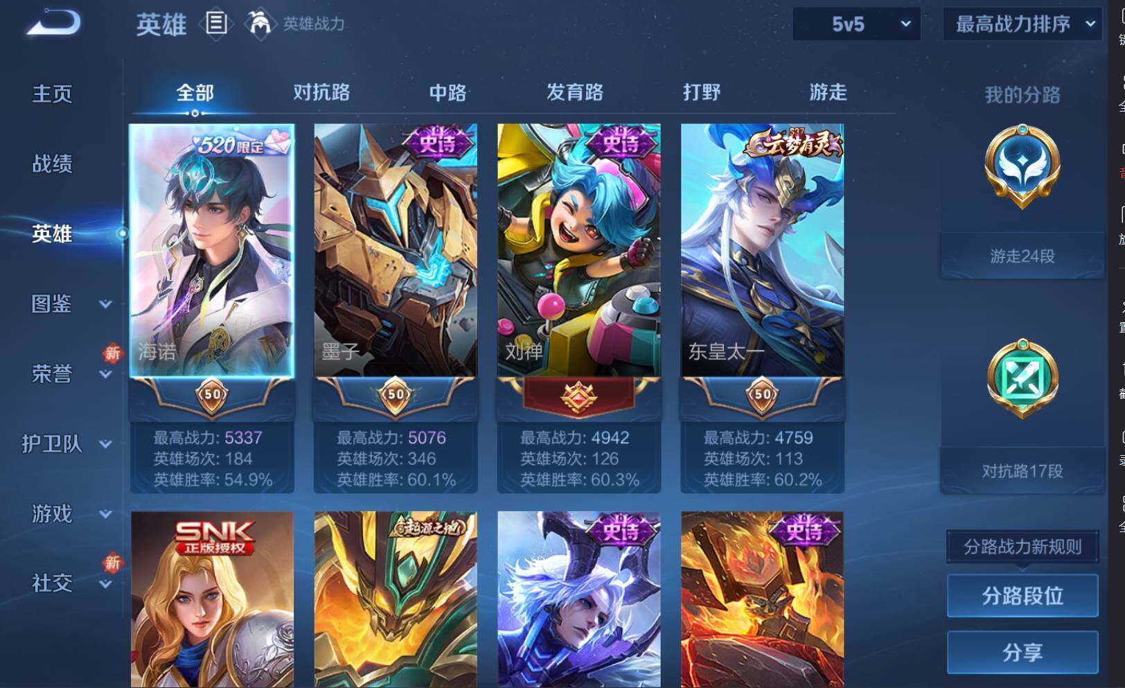- [11685686]V7 1典藏 1珍品传说 12传说 125英雄 339皮肤 可修改实名 优质装备:鸣剑·曳影,怪盗基德,黄金射手座,云鹰飞将(小将军),黄金白羊座,久胜战神,一念神魔,淬星耀世,超时空战士-狄仁杰,山海·炽霜斩(李信年限) 珍宝阁皮:胡桃夹子,优雅恋人,蔷薇恋人 限定皮:愿照·岁时盈(虞姬年限),逐霄战戟,鸣野蒿,至尊宝,魔法小厨娘,时雨天司(水龙头),遇见飞天,高山流水,怒海麟威,降魔,五谷丰年,梁祝,逐梦之音,李小龙,孙行者,神器·万象笔,山海·玄木吟(马可年限) 史诗皮:鸭鸭历险记-刘禅,器灵·浮梦炉,化蝶舞,星界战将,龙之律动,茶境仙,怒海争锋,蒙犽顽岩魄,上官婉儿群星魔术团,蔬乡物语(鲁班七号),百相守梦-黄忠,织梦人,黄金分割率,特工魅影,千年之狐,江河有灵,魅语,百解令(蒙犽),高渐离燃音魔法,蒙恬荣光圣徽,冰冠公主,偶像歌手,电玩·爆裂旋风,百相守梦(刘备),龙骑士(小龙虾),末日机甲-吕布,猫狗日记-孙策,乱世虎臣,节奏热浪,修罗,女仆咖啡,摇滚巨星,水果甜心,绅士熊喵,星夜王子,心灵骇客,功夫厨神,德古拉伯爵,暗隐猎兽者,幽灵船长,鬼剑武藏,心灵战警,地狱岩魂,纤云弄巧,拒霜思,乘风破浪,逐浪之夏,水晶猎龙者,曙光守护者,热力回旋,箭羽风息,金属风暴,原初追逐者,圣诞狂欢,圣诞恋歌,鹰眼统帅,王者之锤,魅力维加斯,黎明之约,赏金猎手,无心,未来纪元-赵云