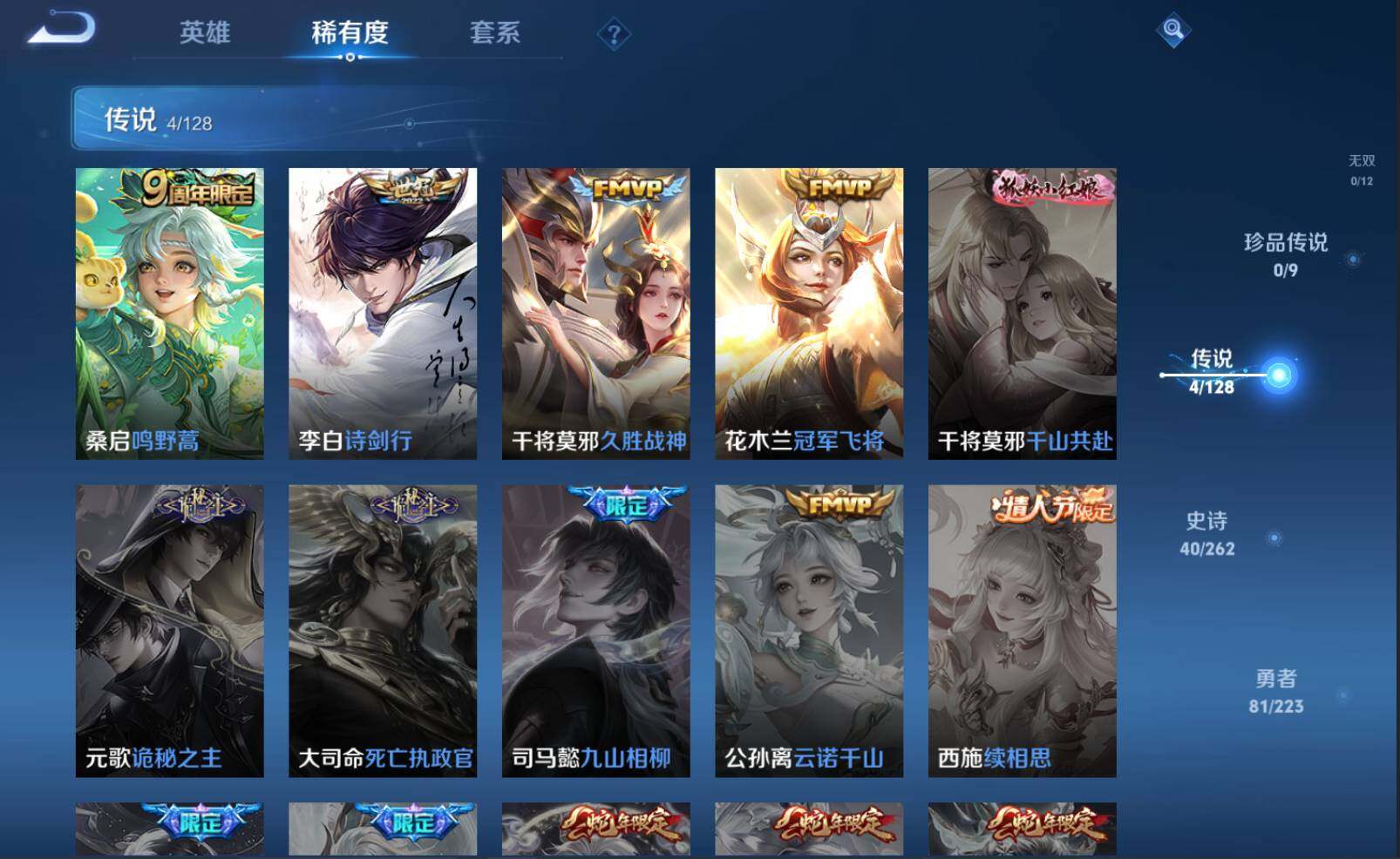 【限定皮肤】:蒙犽顽岩魄,姜子牙天穹之誓,杨戬破阵退雄兵,狄仁杰阴阳师,孙尚香蔷薇恋人,庄周高山流水,元歌无心,狄仁杰万华元夜,达摩沙漠行僧,项羽海滩派对,程咬金演武夺筹,兰陵王金庭之子,李元芳云中旅人,钟馗驱傩正仪,鬼谷子原初探秘者,鬼谷子五谷丰年,苏烈千军破阵,百里玄策原初追逐者,梦奇顽趣,沈梦溪大漠名商,裴擒虎擒涛扼浪,猪八戒猪悟能,上官婉儿梁祝,鲁班大师探海日志,桑启海盐诗旅,艾琳女武神,阿古朵江河有灵,张良古海寻踪,蒙恬荣光圣徽,鬼谷子天穹祈灯,沈梦溪龙舞盛年,刘邦剑破天穹,程咬金群星魔术团,海诺心动手记,周瑜熔金海岸